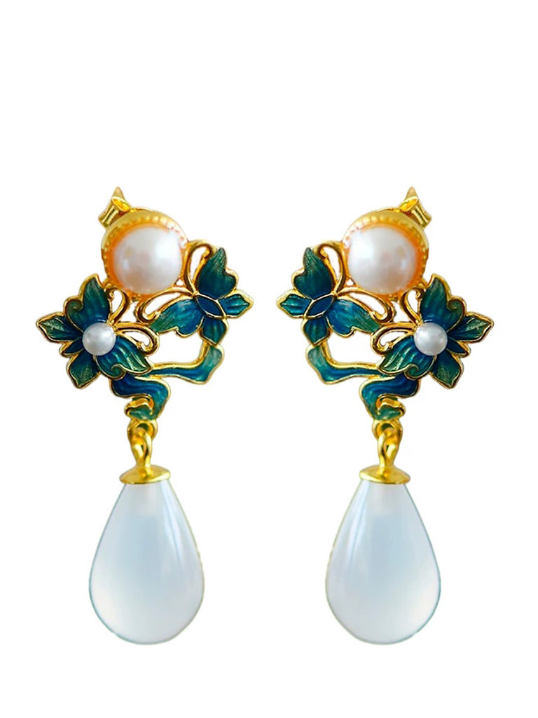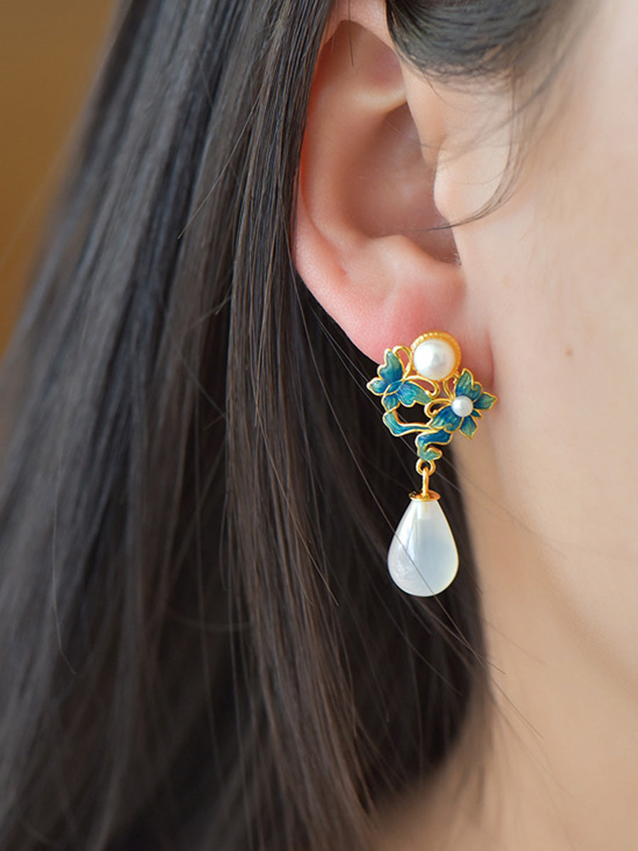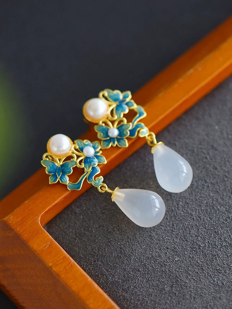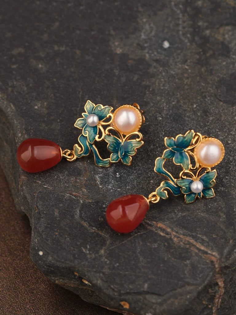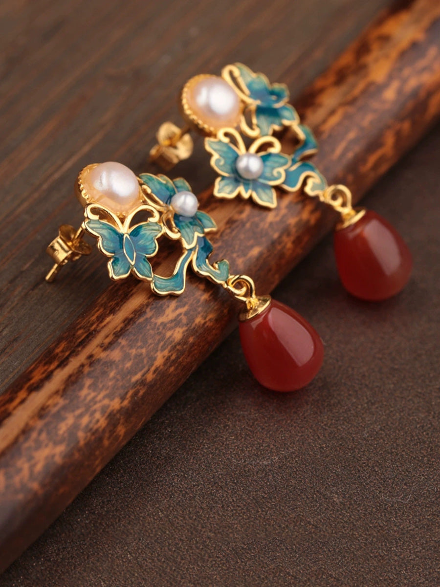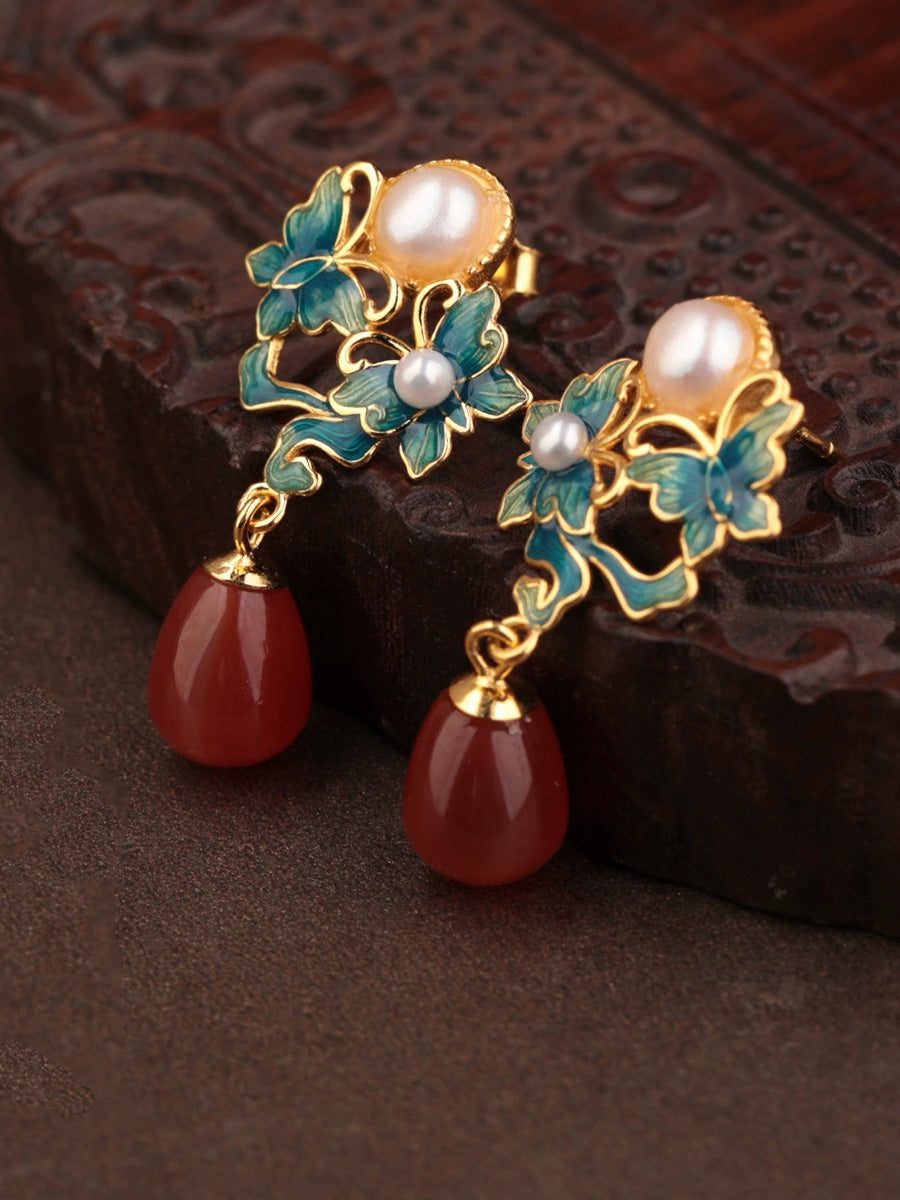 Brincos femininos étnicos com borboleta em esmalte, prata S925, pérola e ágata.