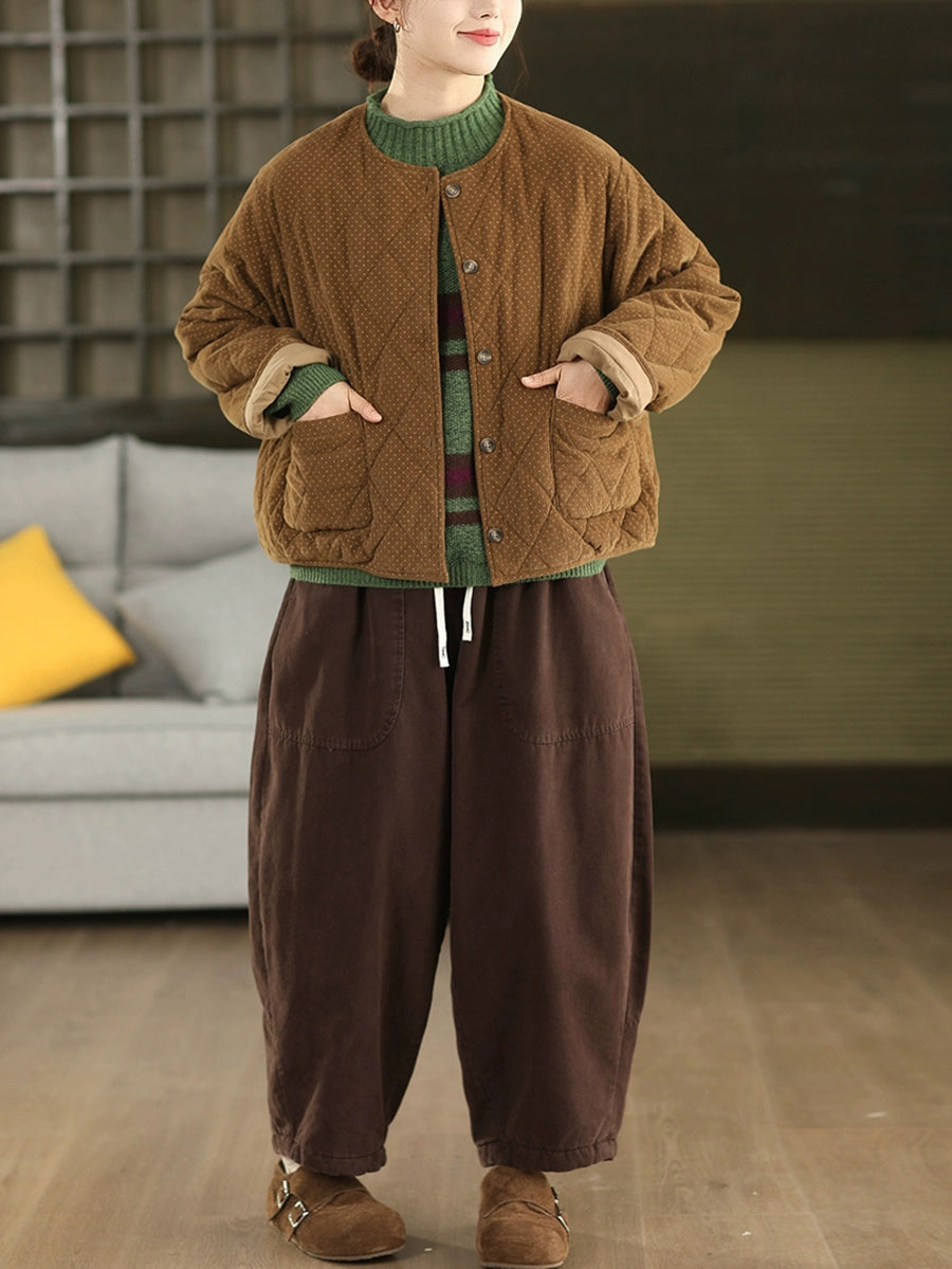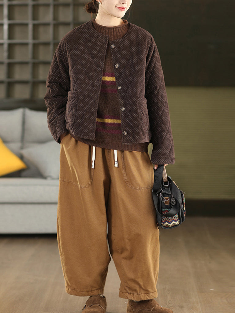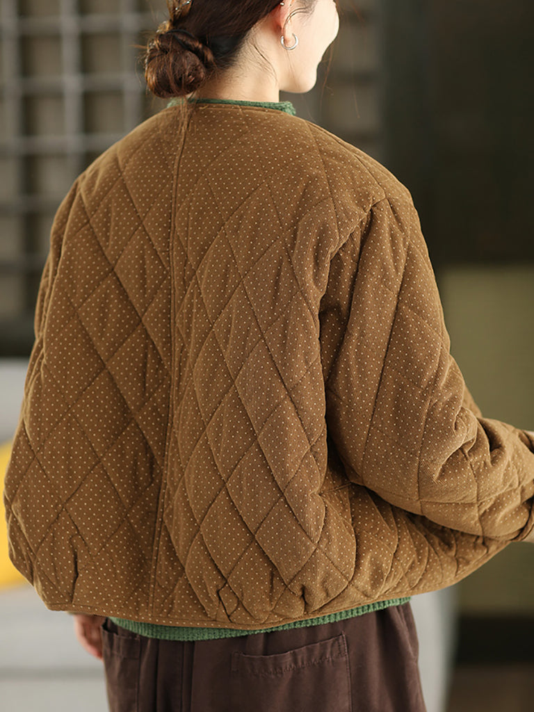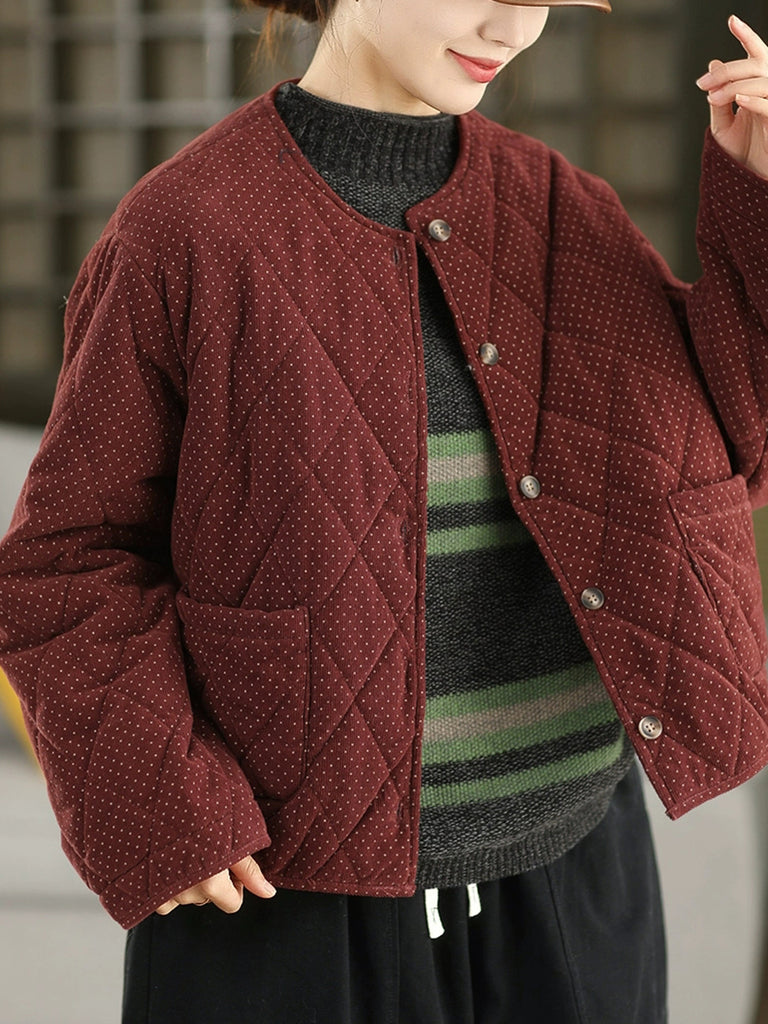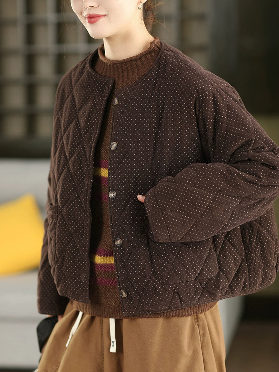 Jaqueta feminina de inverno retrô com estampa de bolinhas, gola redonda e acolchoamento em veludo cotelê.