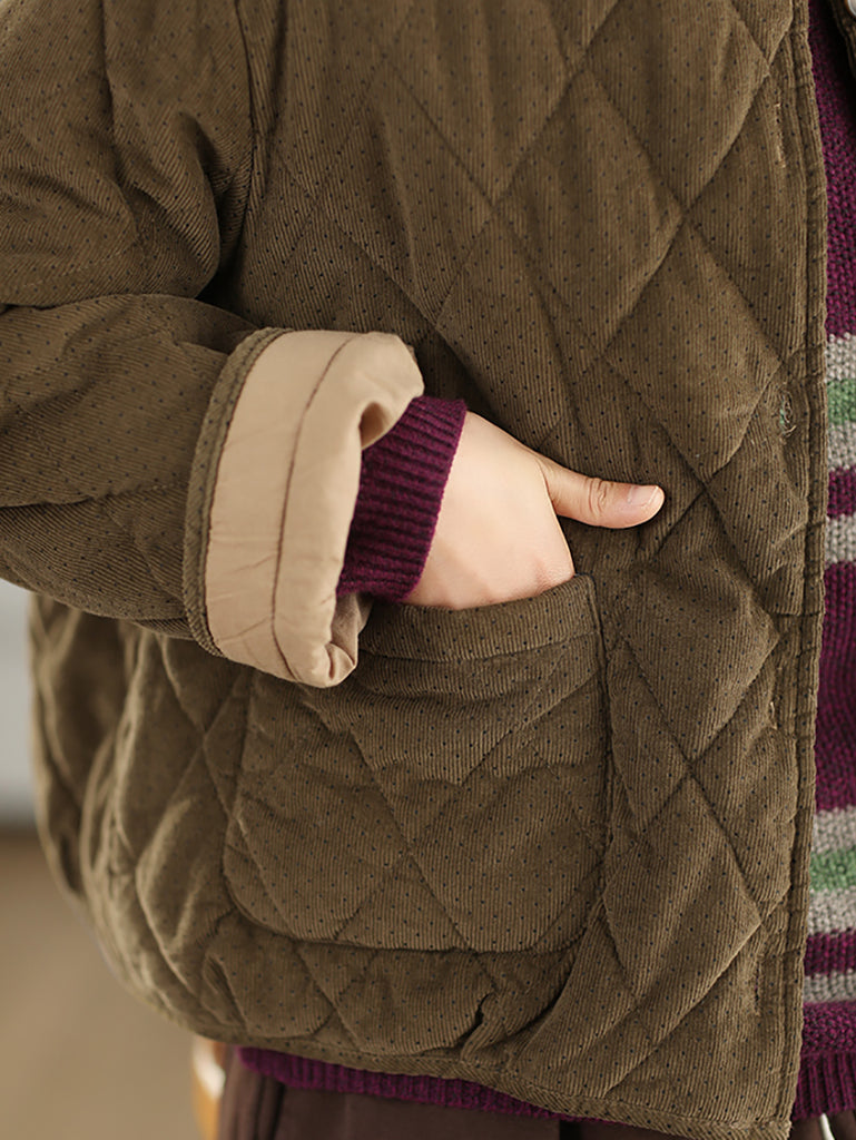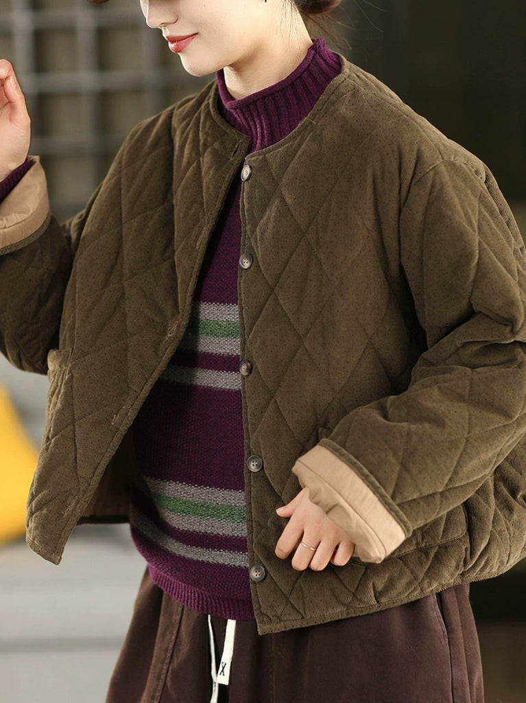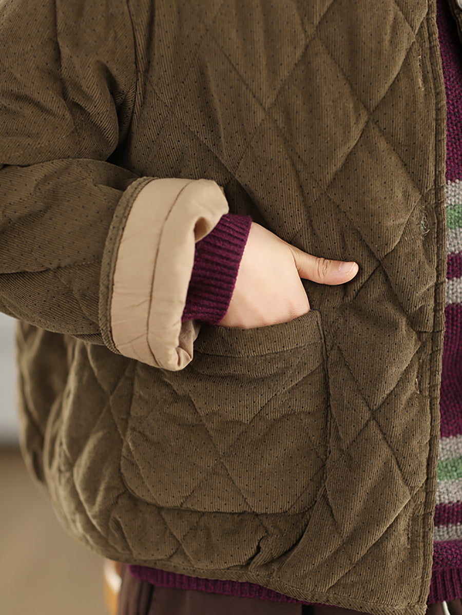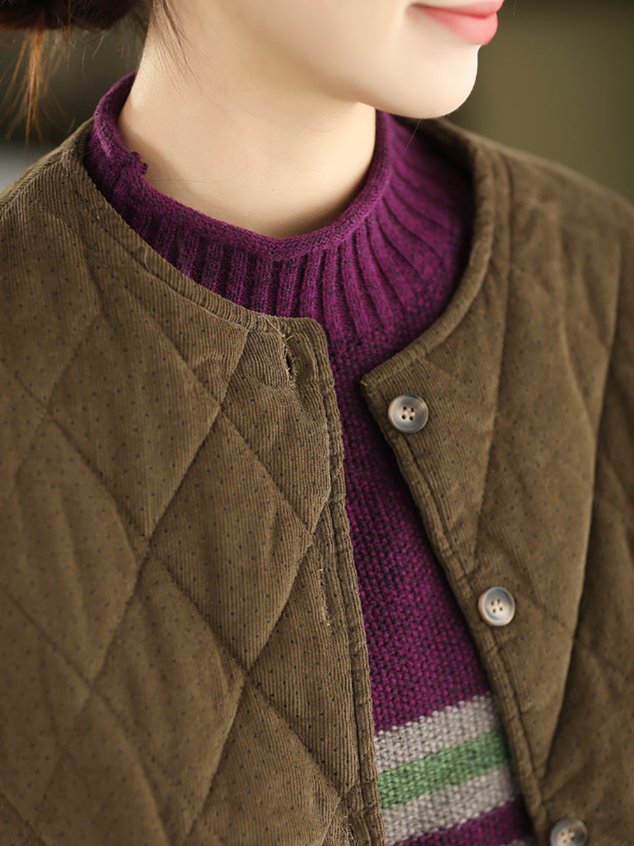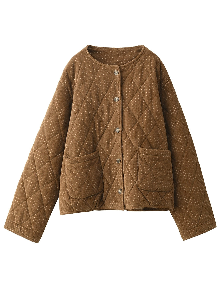 Jaqueta feminina de inverno retrô com estampa de bolinhas, gola redonda e acolchoamento em veludo cotelê.