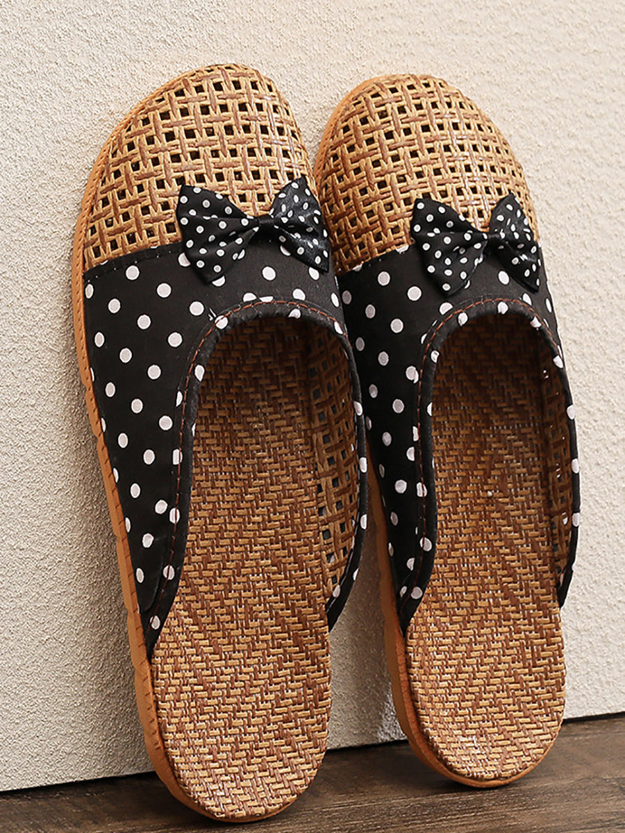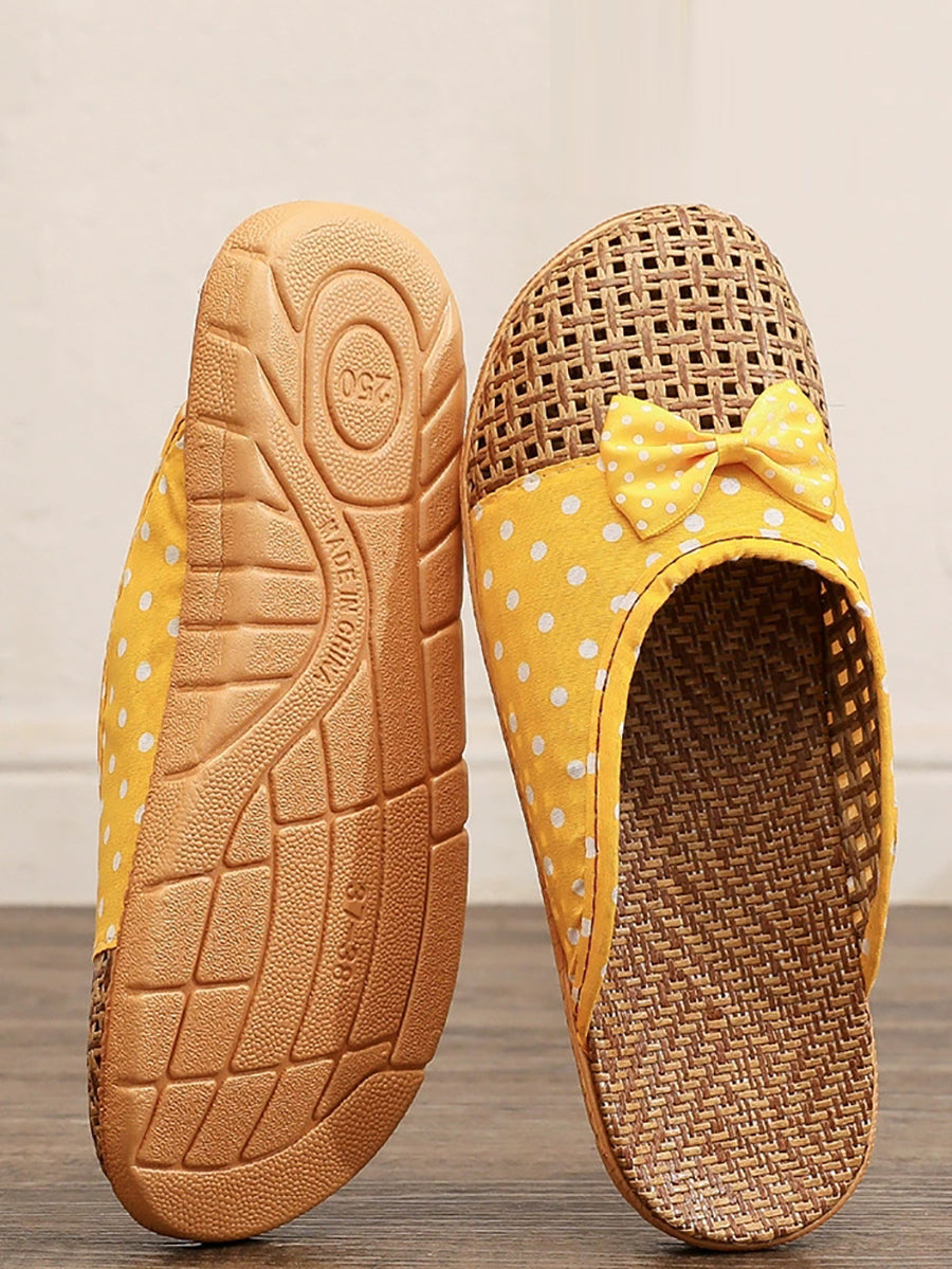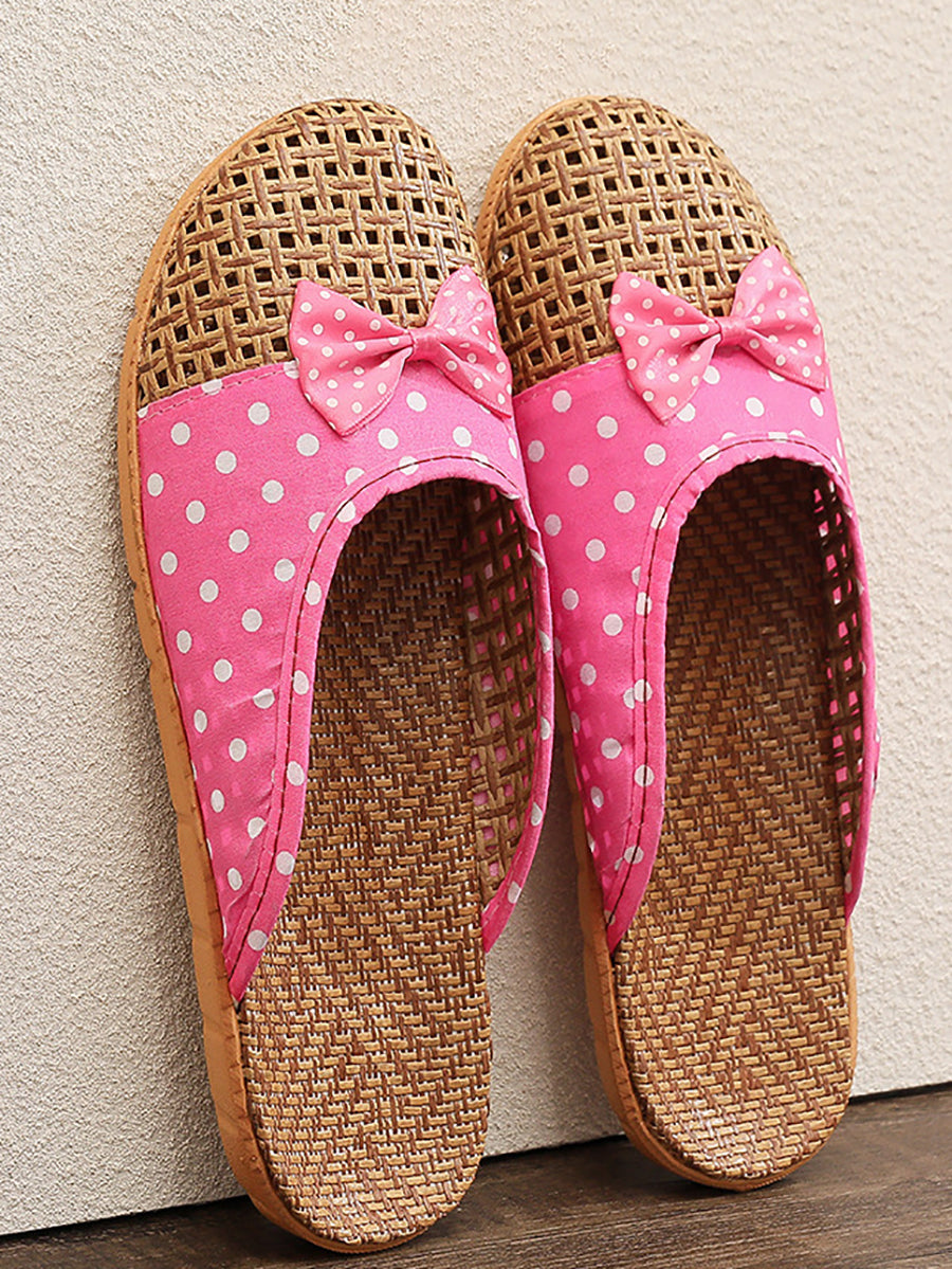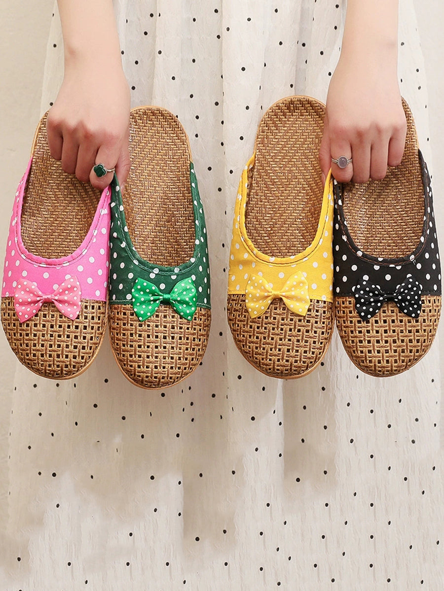Pantufas de verão para casal, em palha trançada com detalhes em bolinhas.