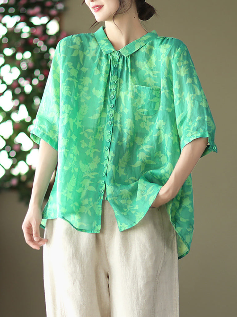 Plus Size Vintage Floral Ramie Casual Verão Mulheres Camisa