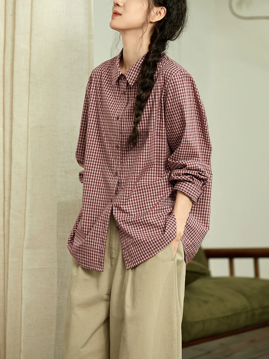 Blusa feminina de verão xadrez com gola dobrável, 100% algodão.