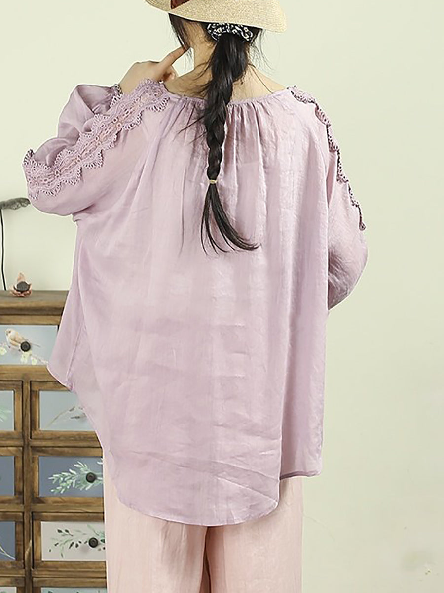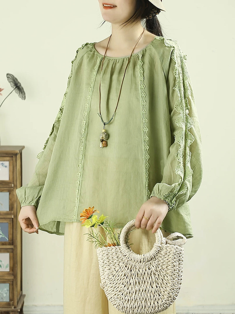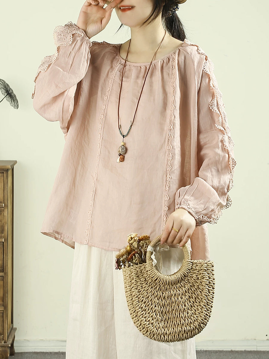 Cămașă pentru femei cu guler în O, 100% ramie, cu dantelă și imprimeu artistic de primăvară