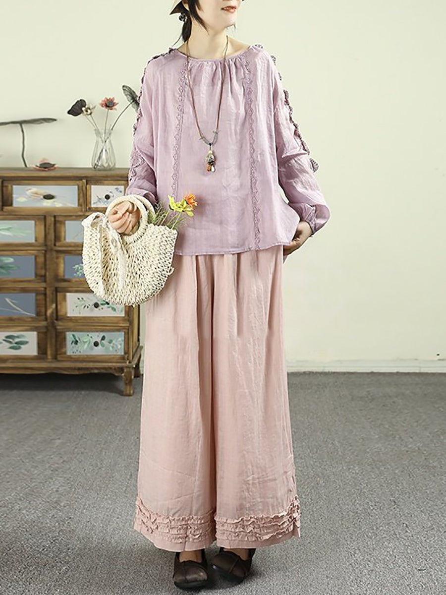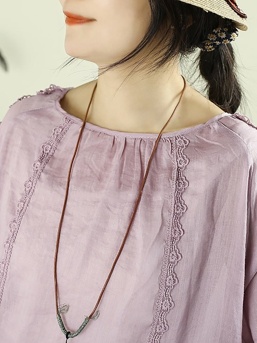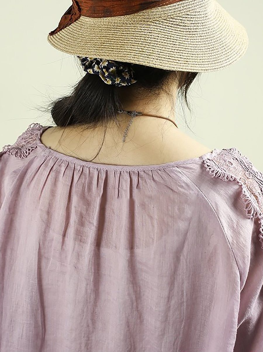 Cămașă pentru femei cu guler în O, 100% ramie, cu dantelă și imprimeu artistic de primăvară