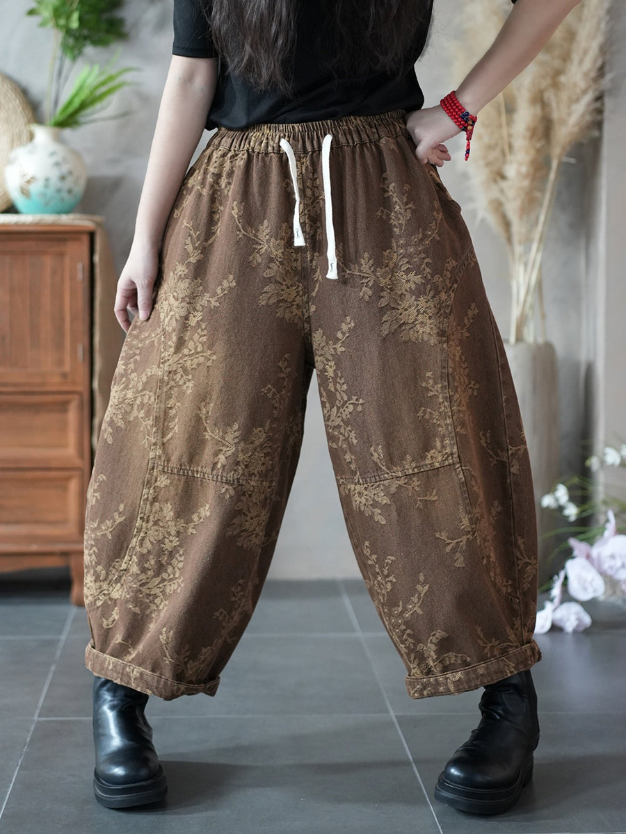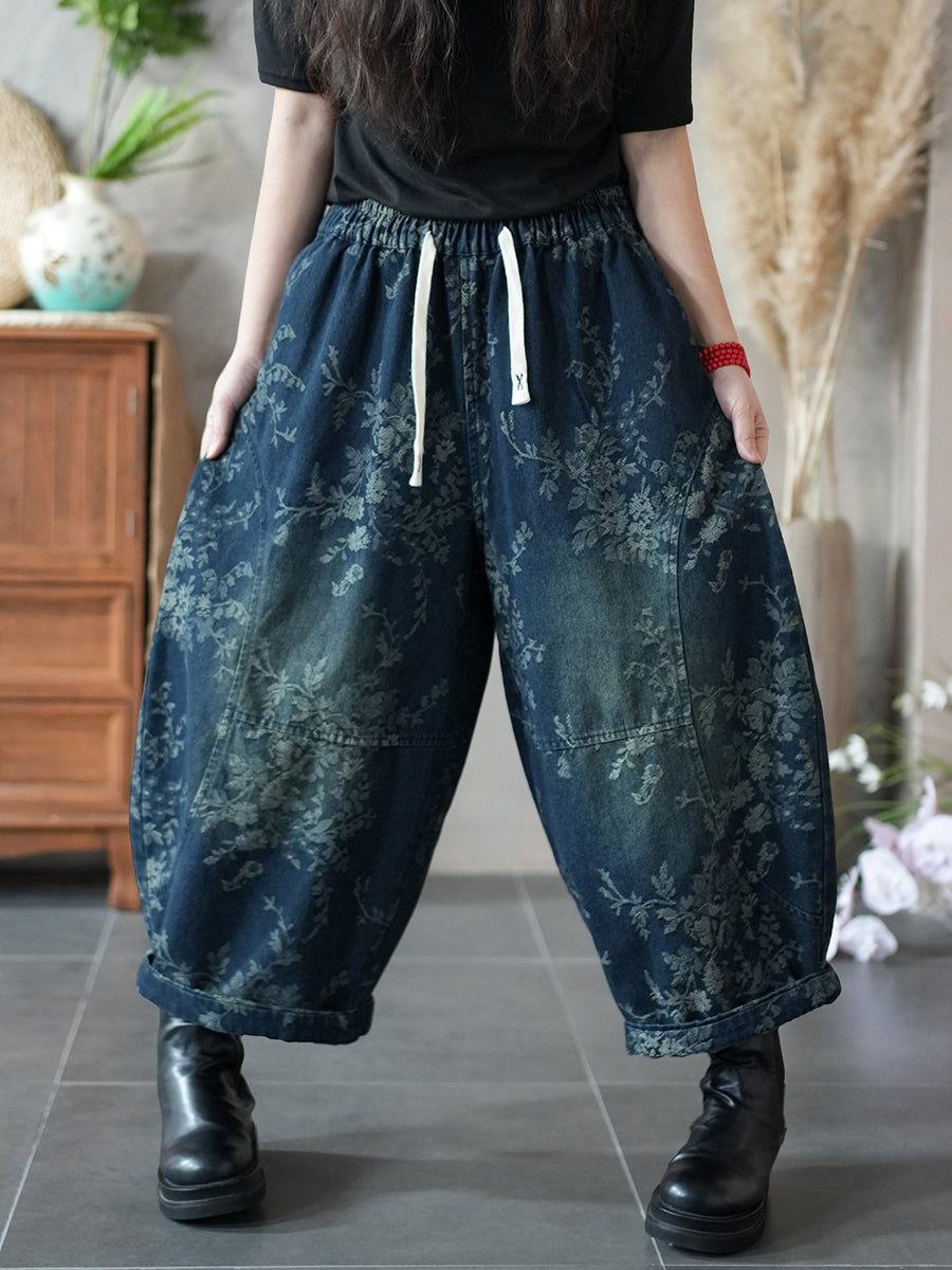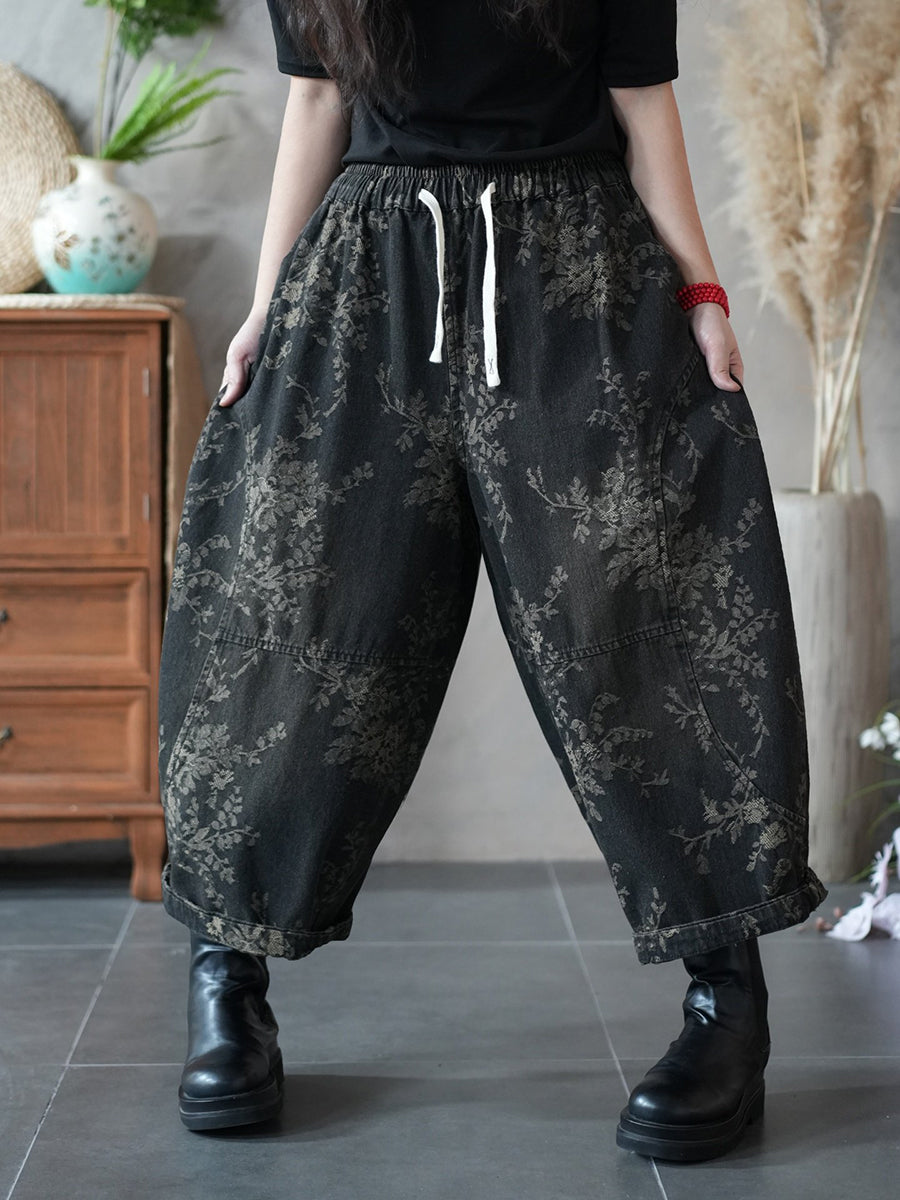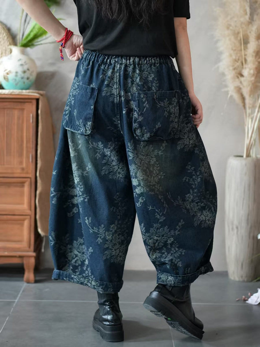 Pantaloni harem din denim cu flori artistice pentru femei, de primăvară