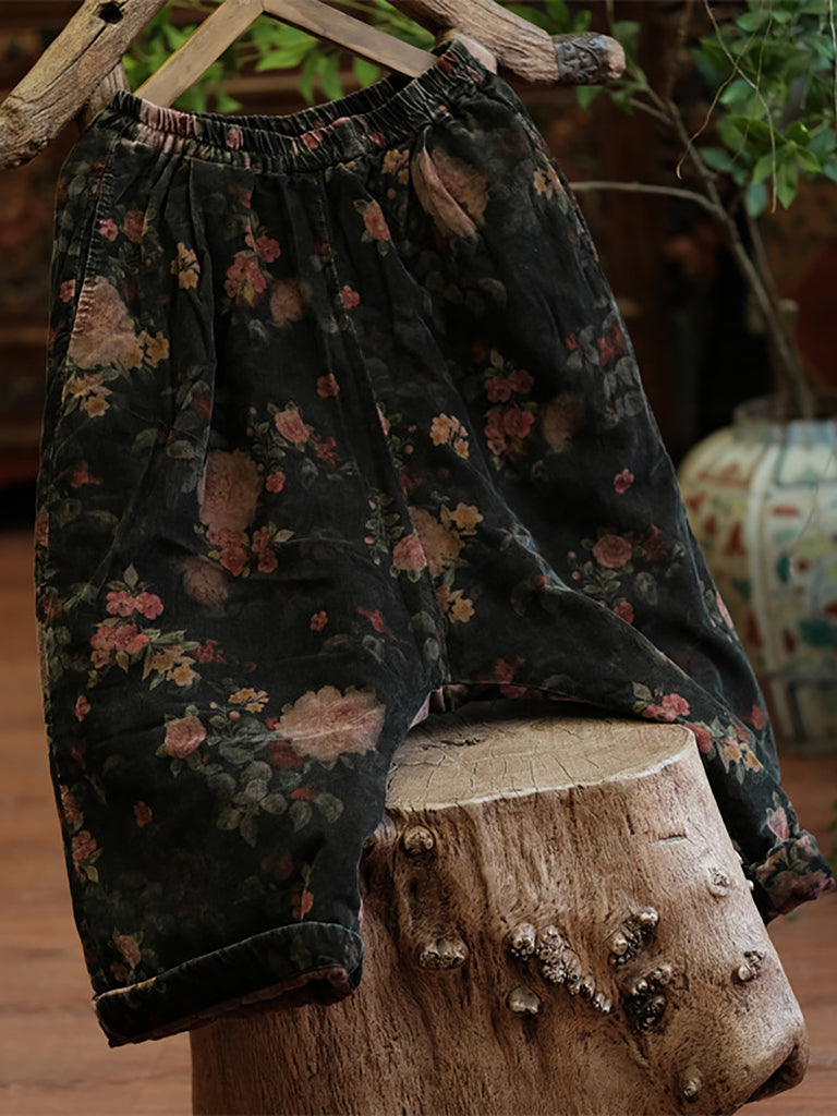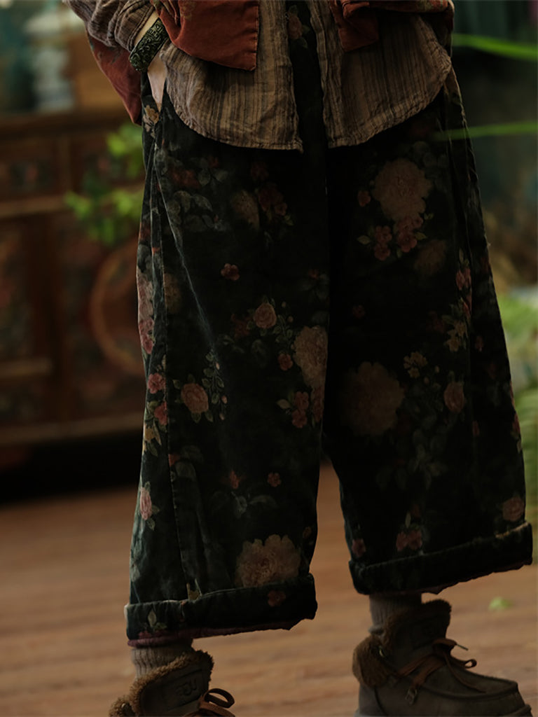 Pantaloni largi din bumbac cu flori de iarnă pentru femei