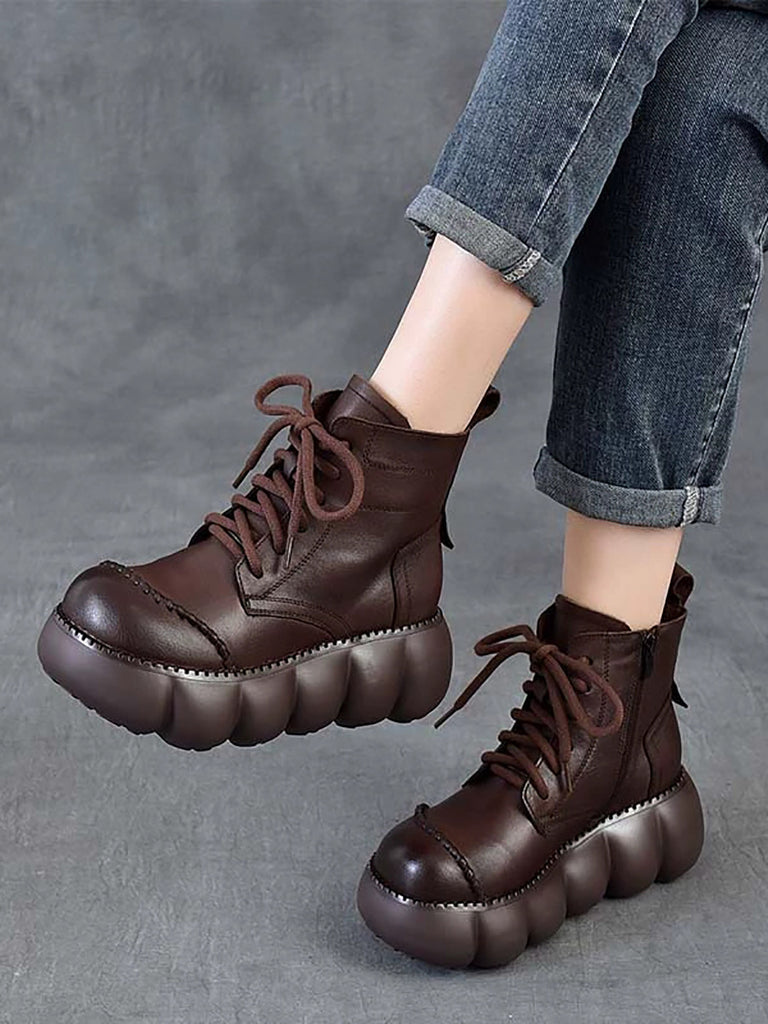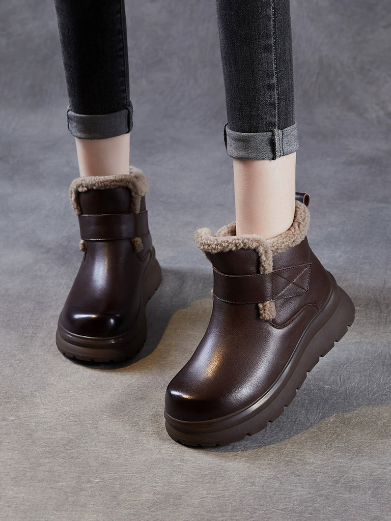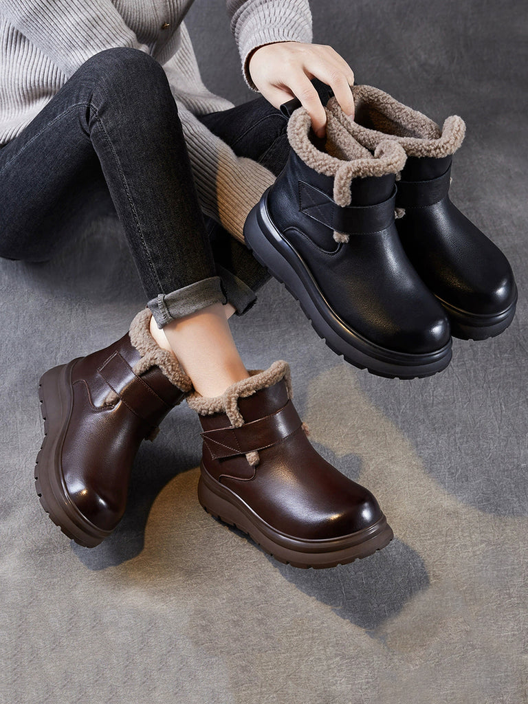 Cizme cu platformă din piele naturală vintage pentru femei, căptușite cu fleece