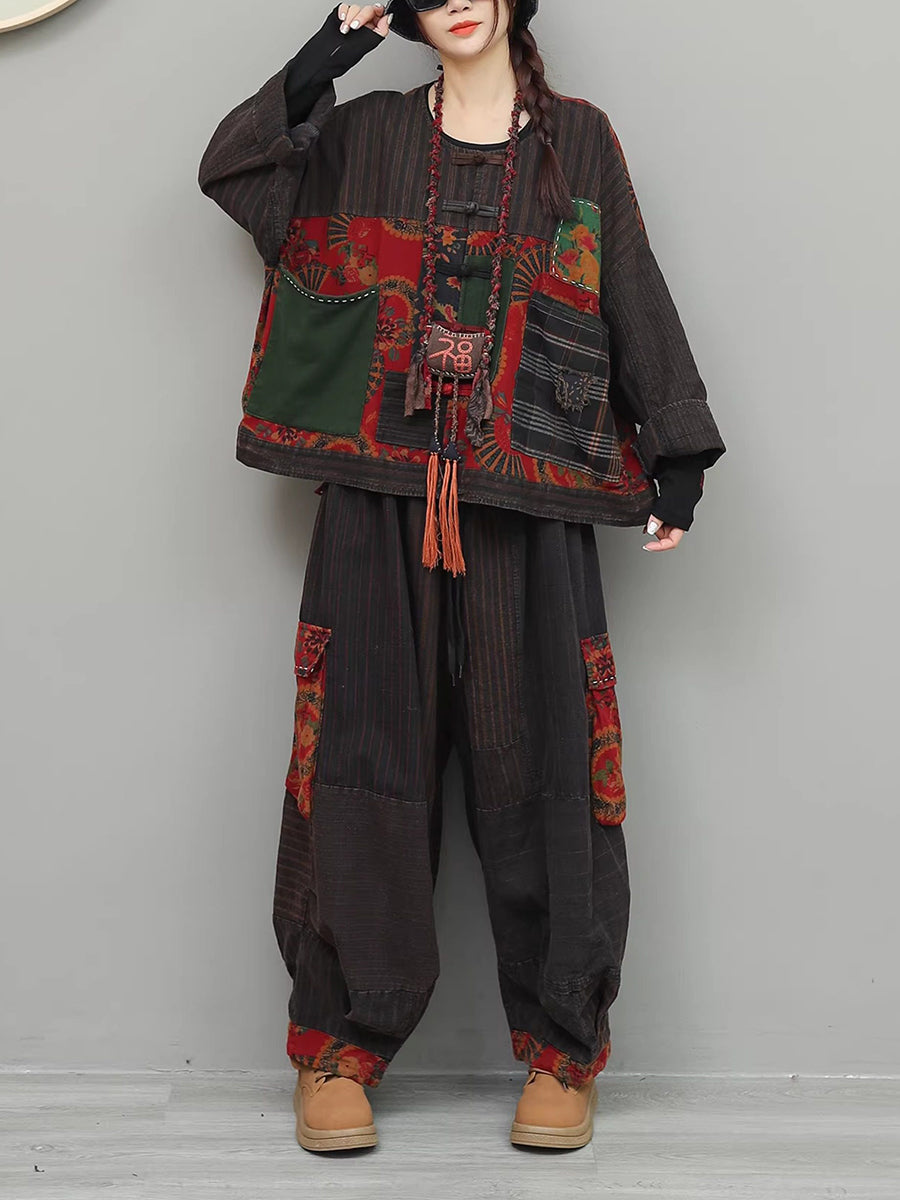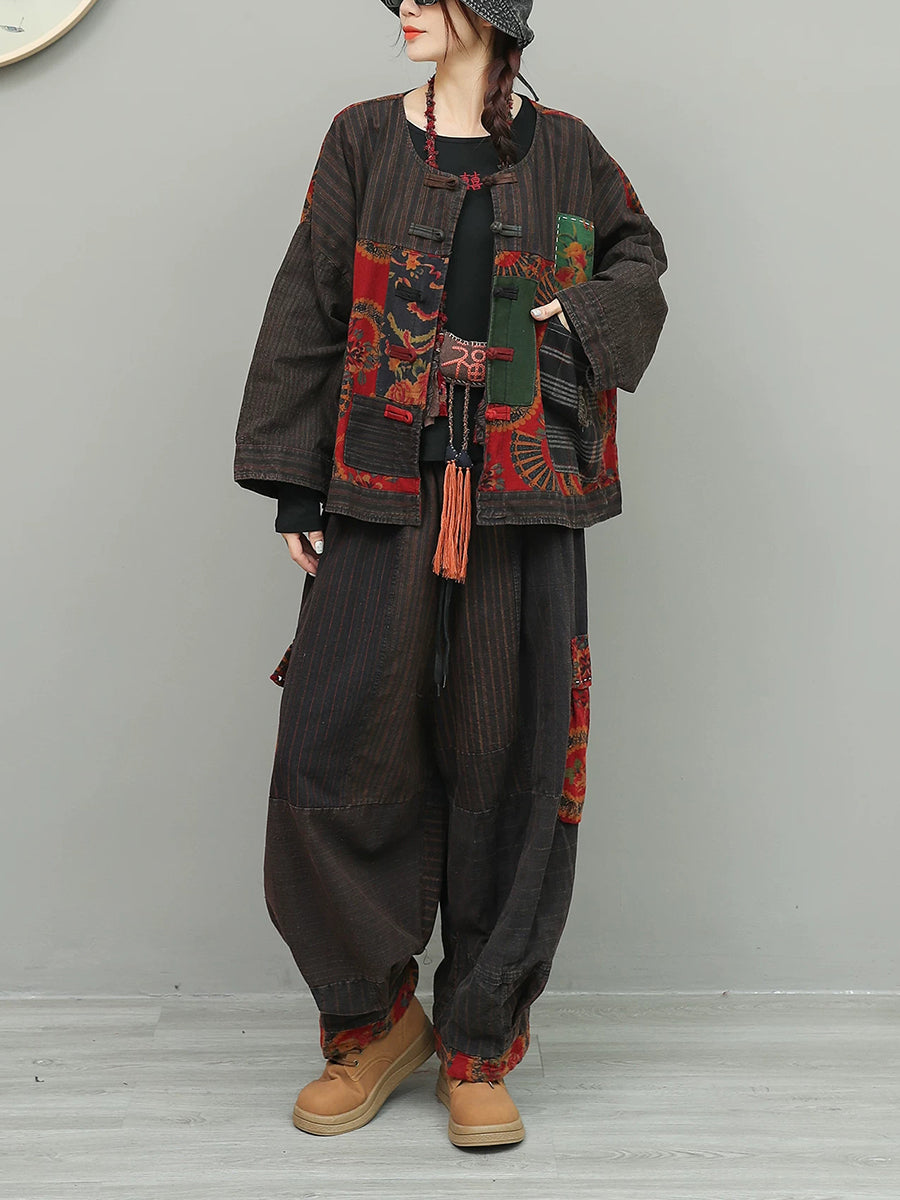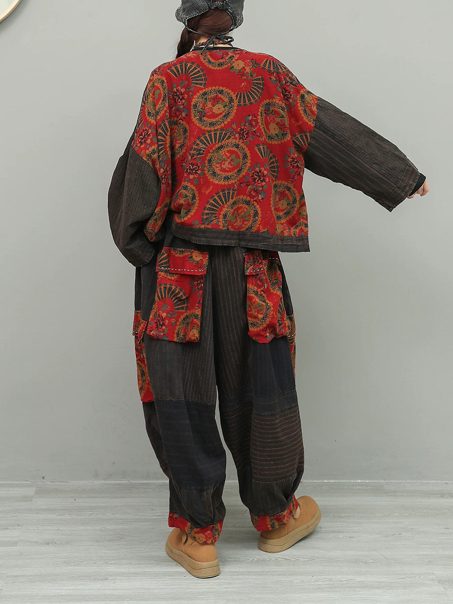 Costume de primăvară pentru femei cu imprimeu floral etnic și guler O