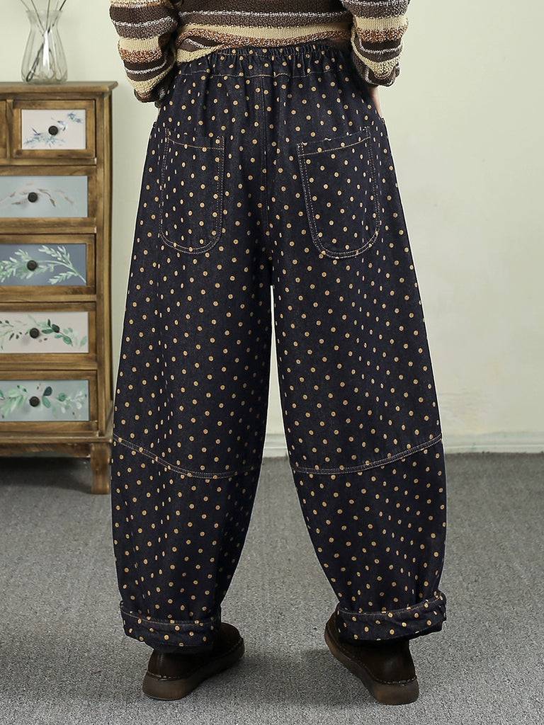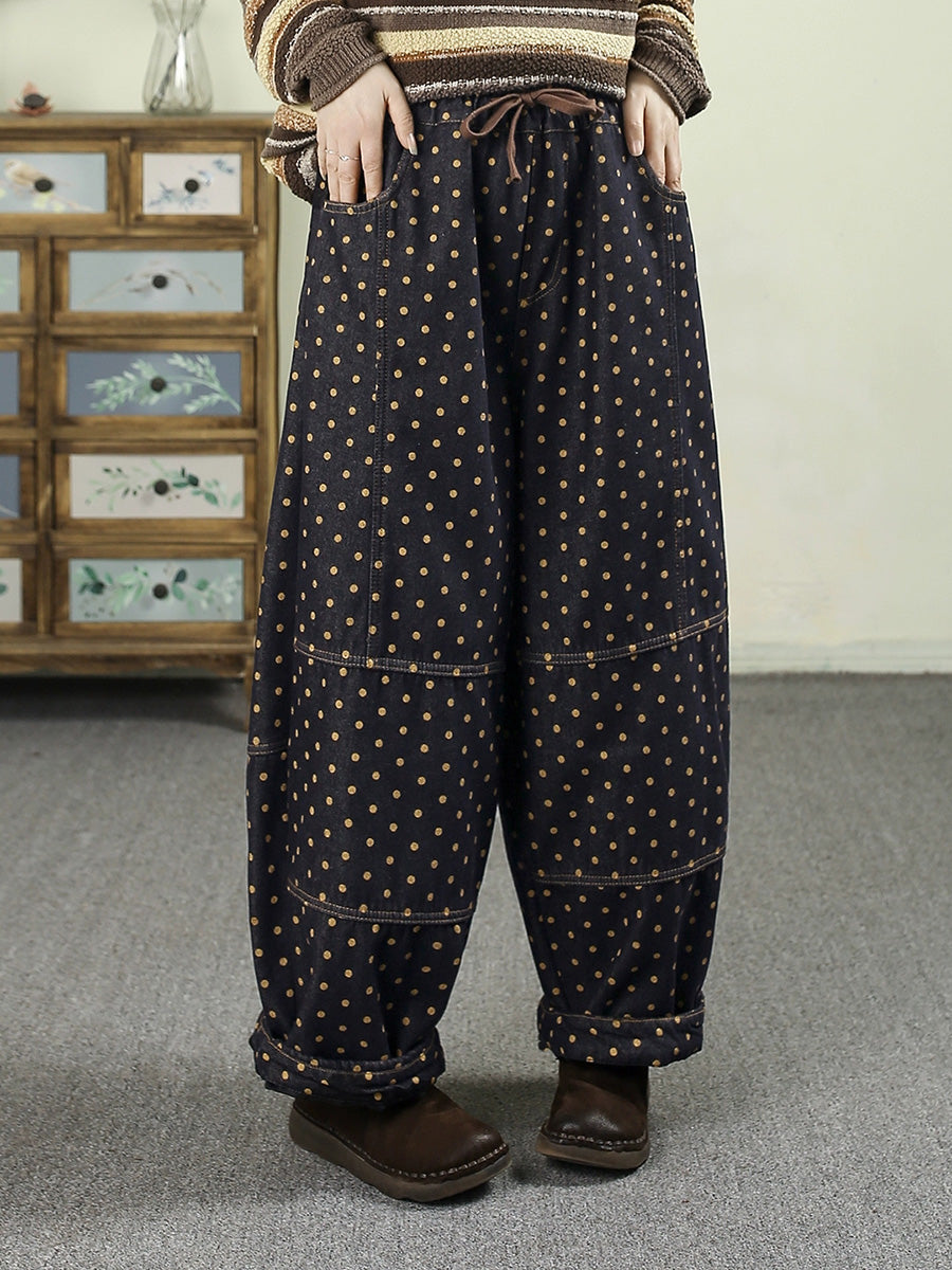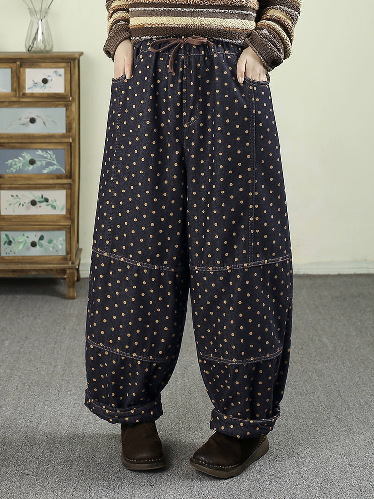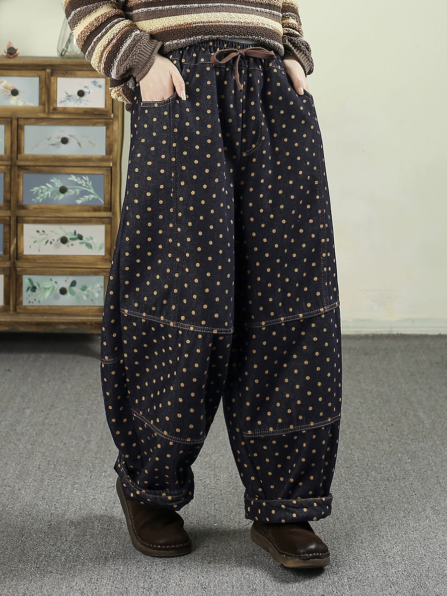 Pantaloni harem pentru femei, stil retro de iarnă, cu buline, din denim, căptușiți cu fleece