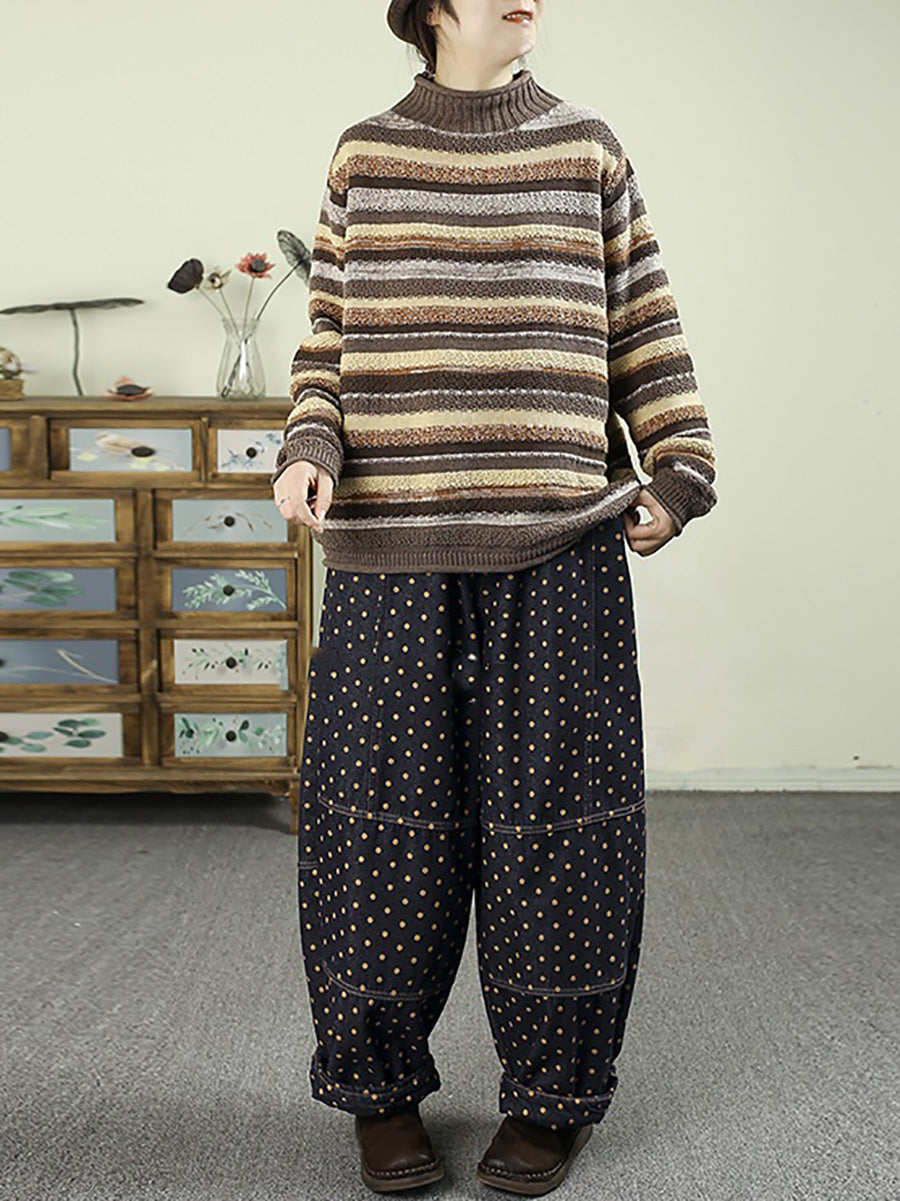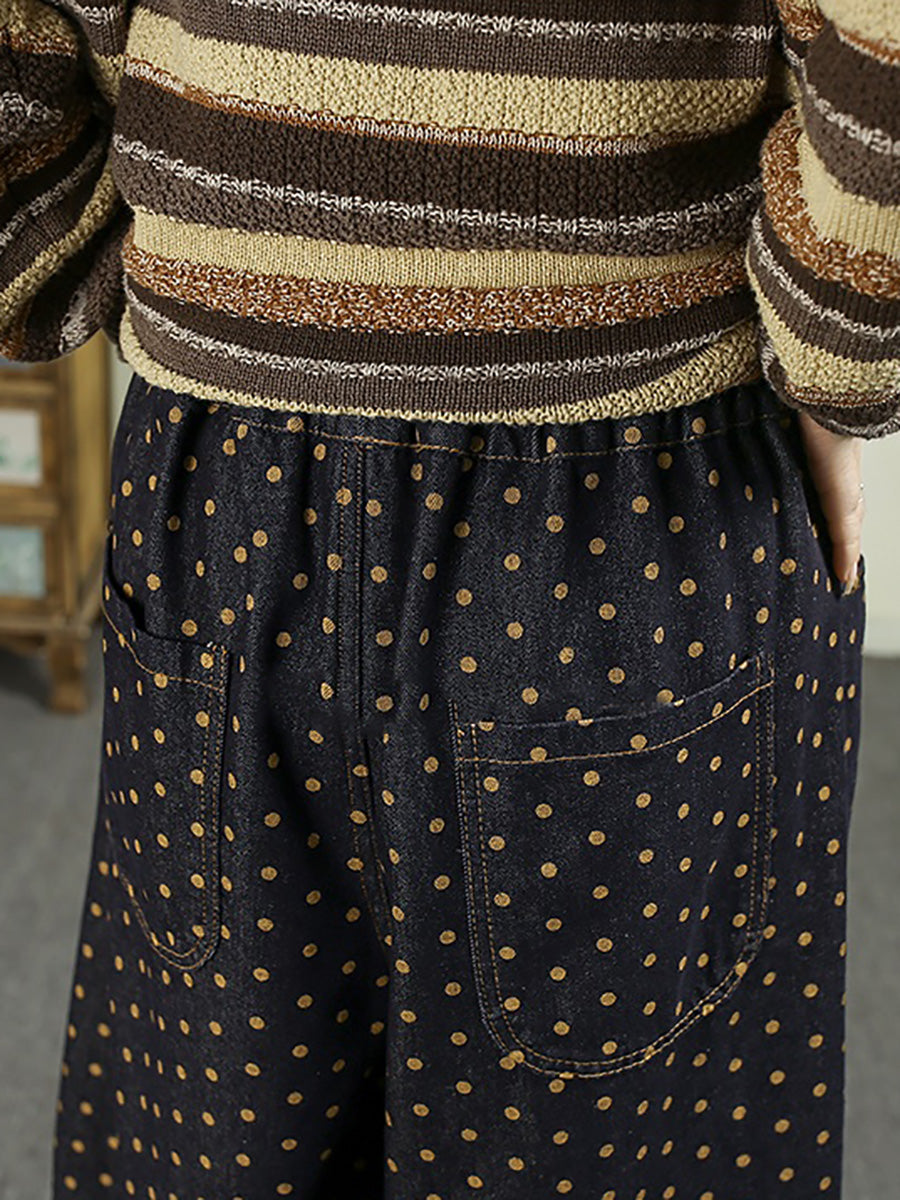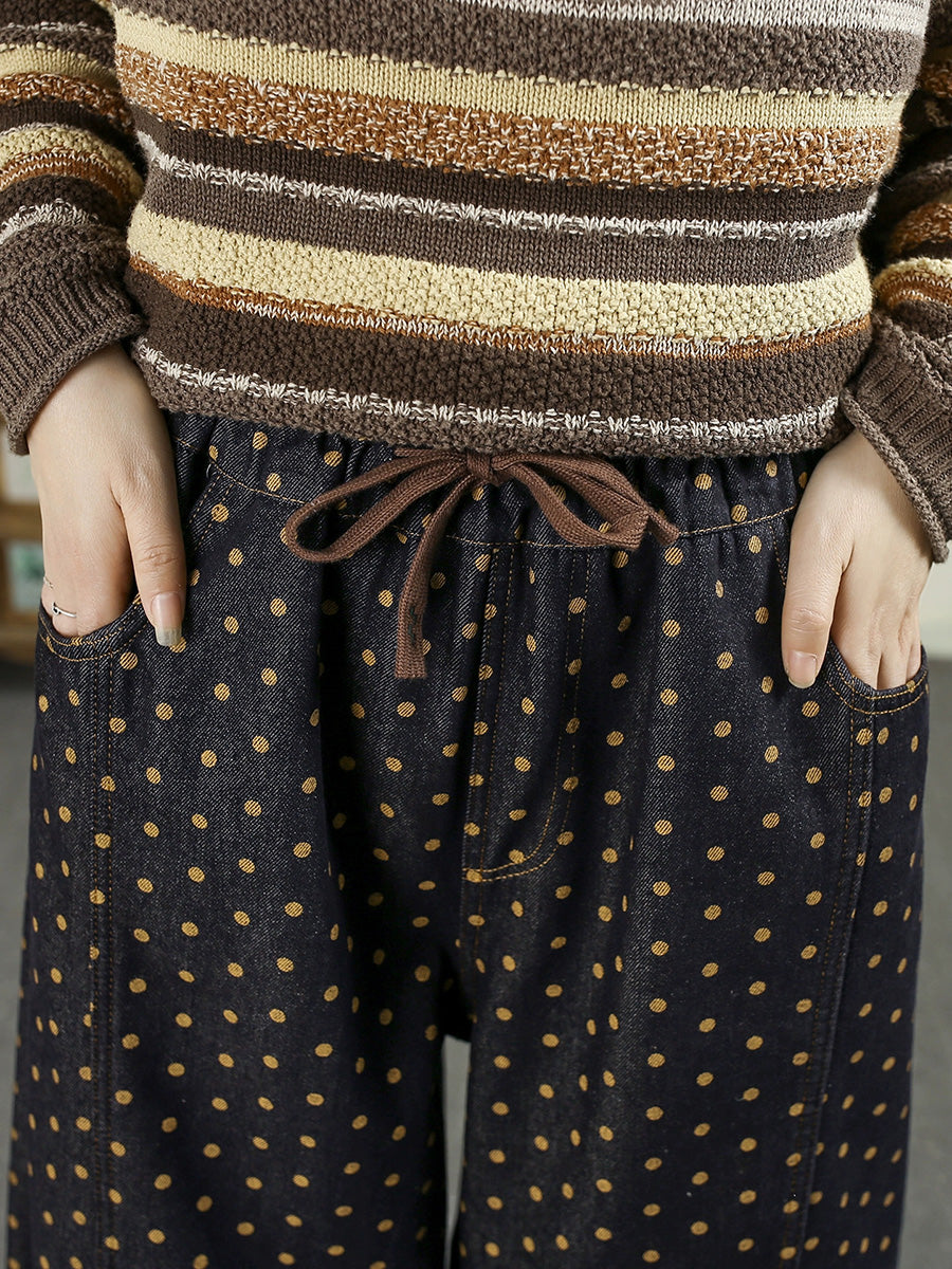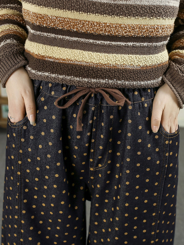 Pantaloni harem pentru femei, stil retro de iarnă, cu buline, din denim, căptușiți cu fleece