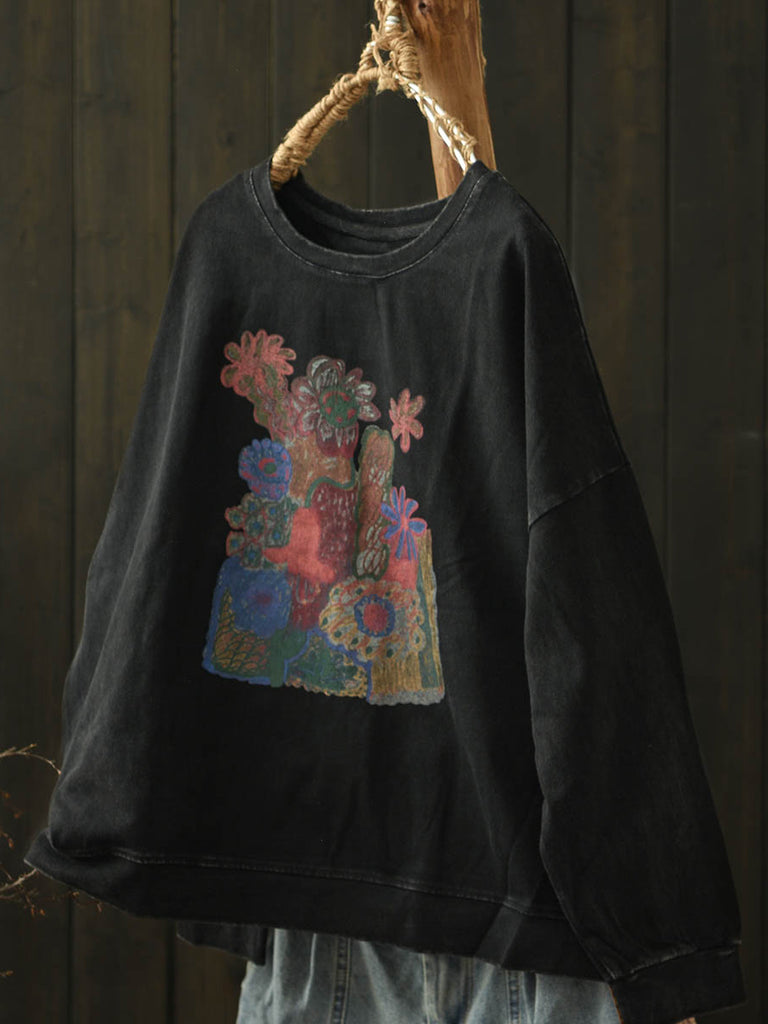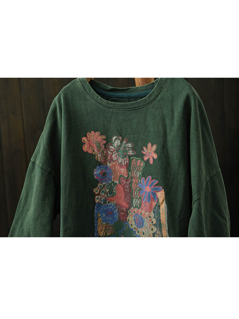 Bluză de bumbac cu guler O și flori artistice pentru femei, toamnă