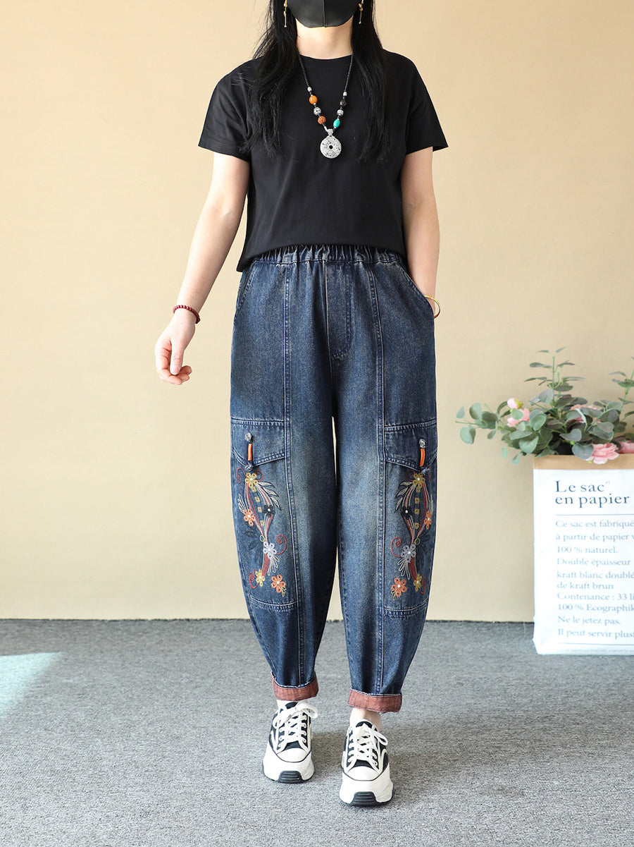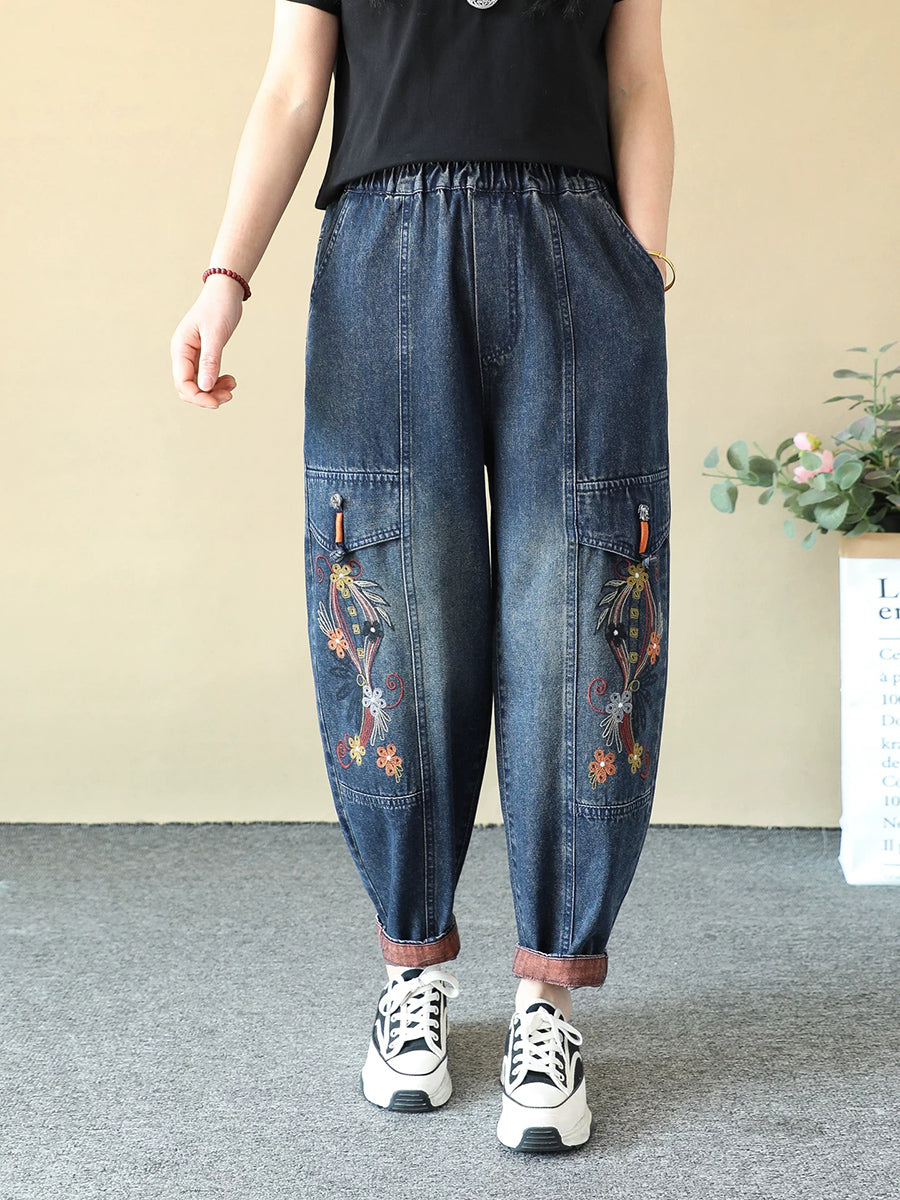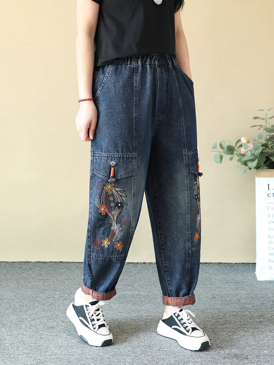 Pantaloni harem cu broderie din denim vintage pentru femei, de primăvară
