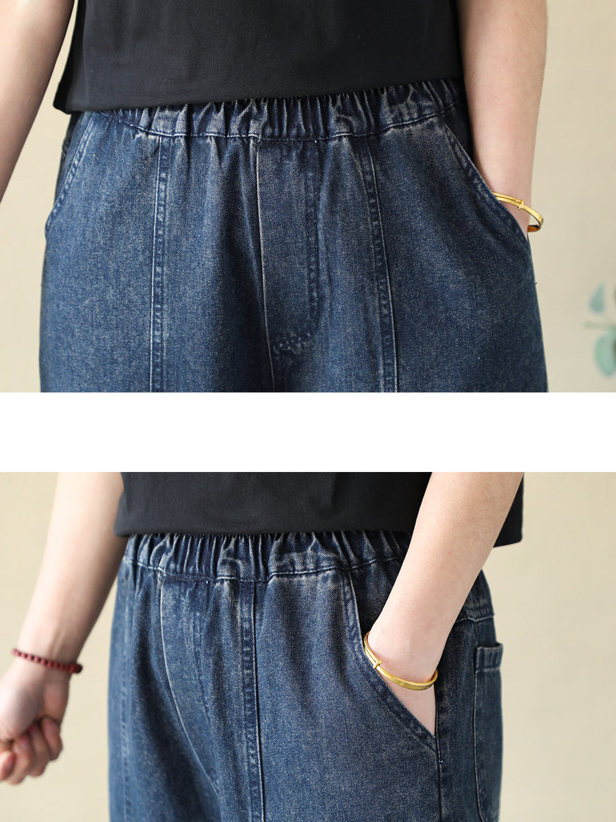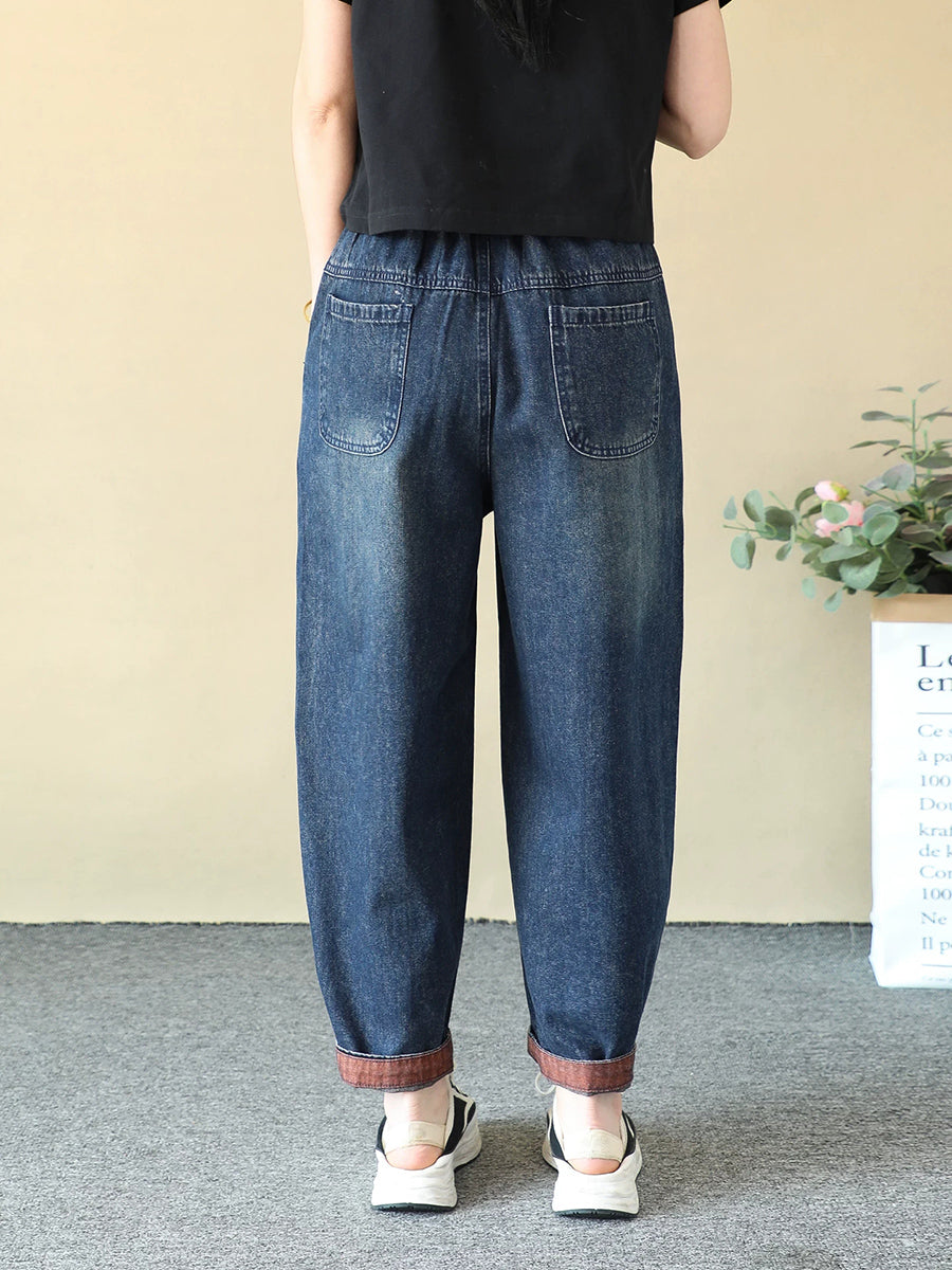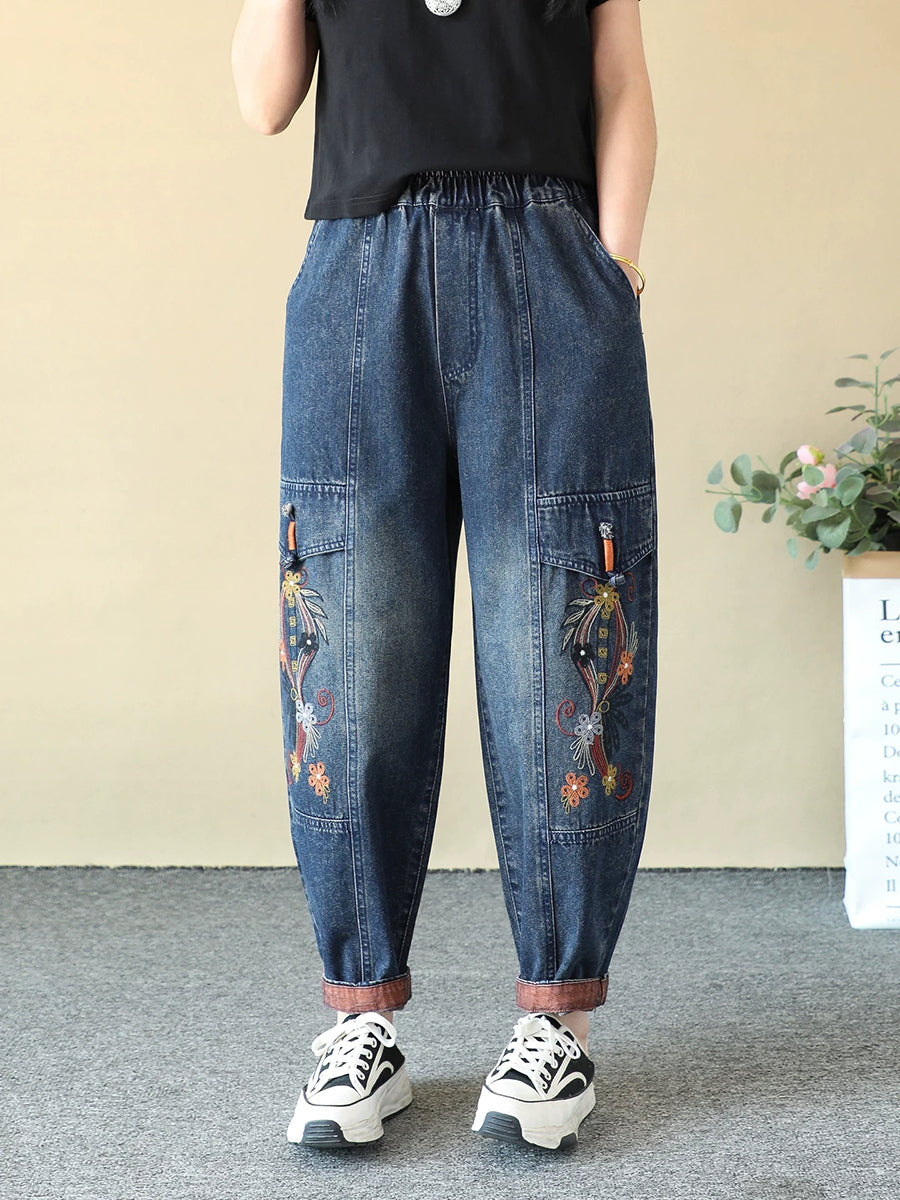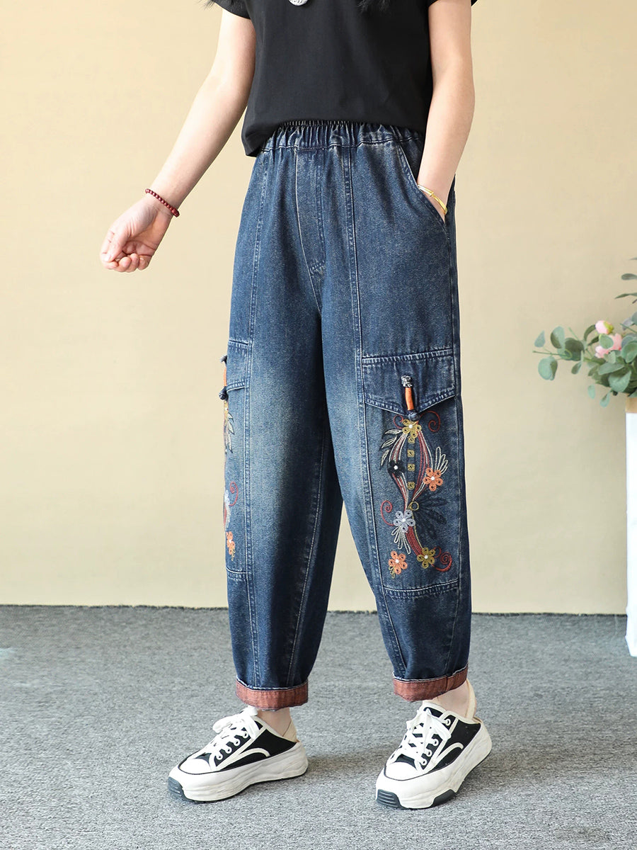 Pantaloni harem cu broderie din denim vintage pentru femei, de primăvară