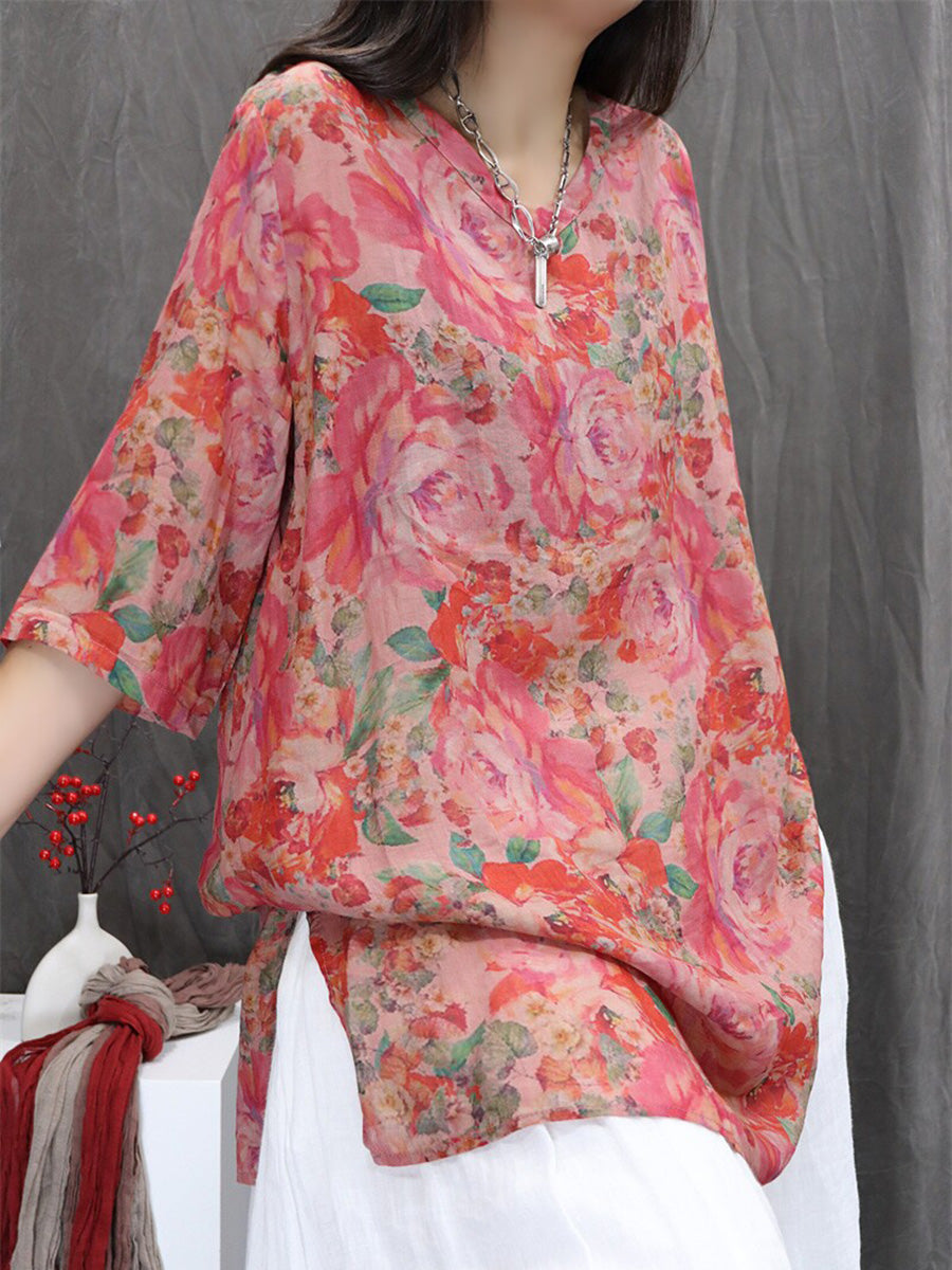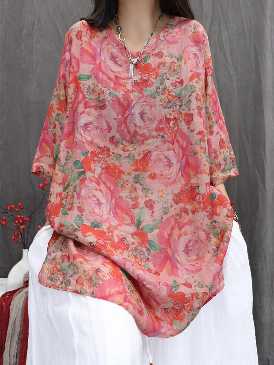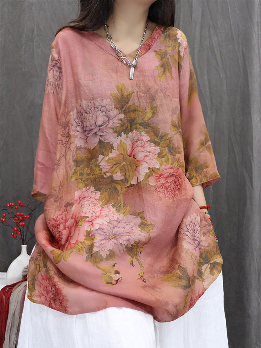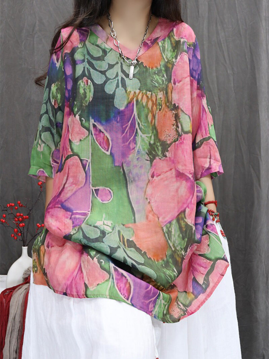 Bluză de vară pentru femei cu imprimeu floral artistic, 100% ramie, cu decolteu în V
