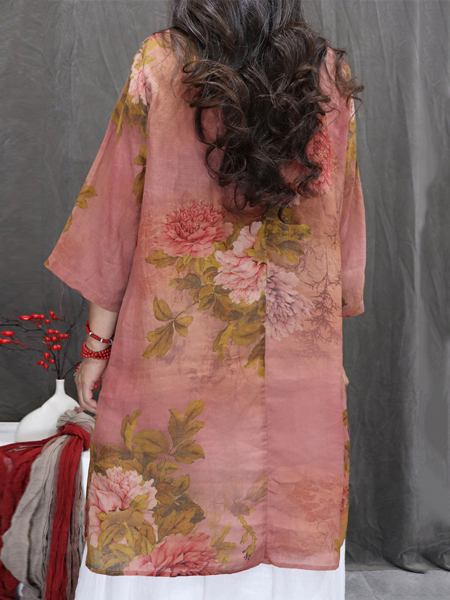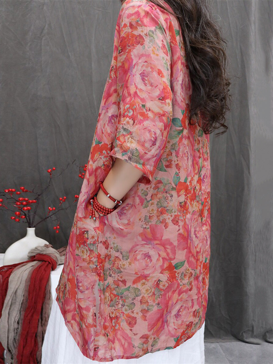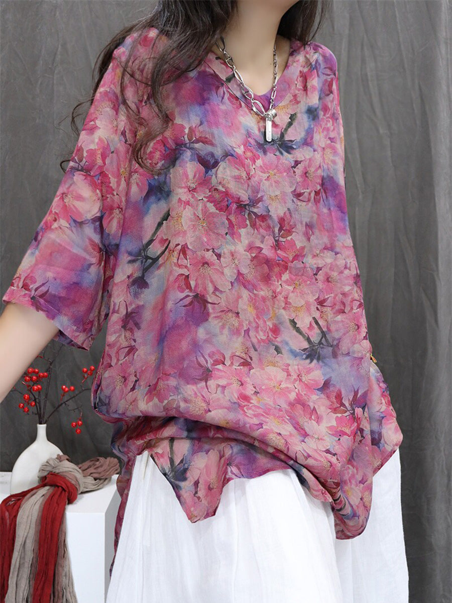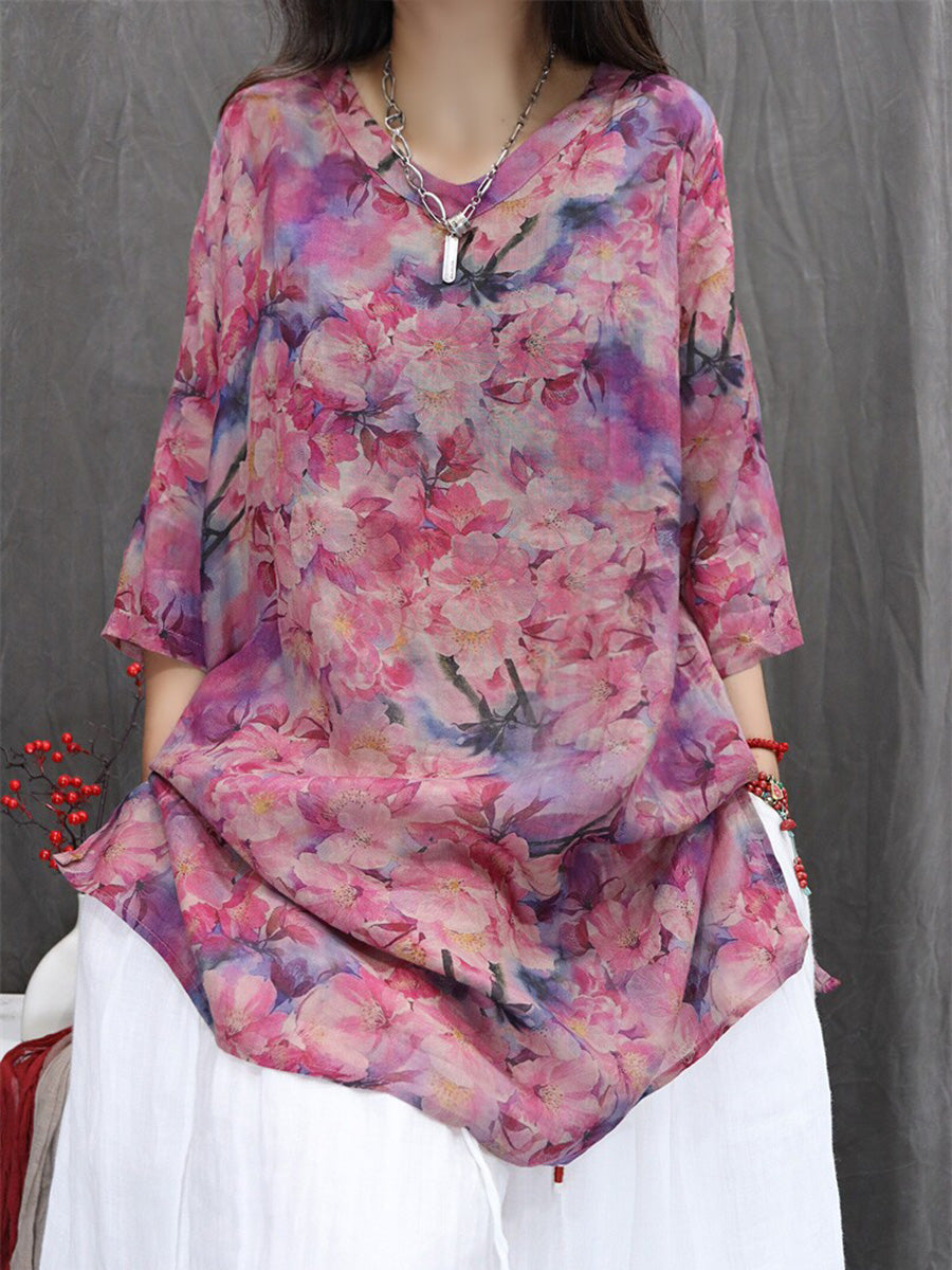 Bluză de vară pentru femei cu imprimeu floral artistic, 100% ramie, cu decolteu în V