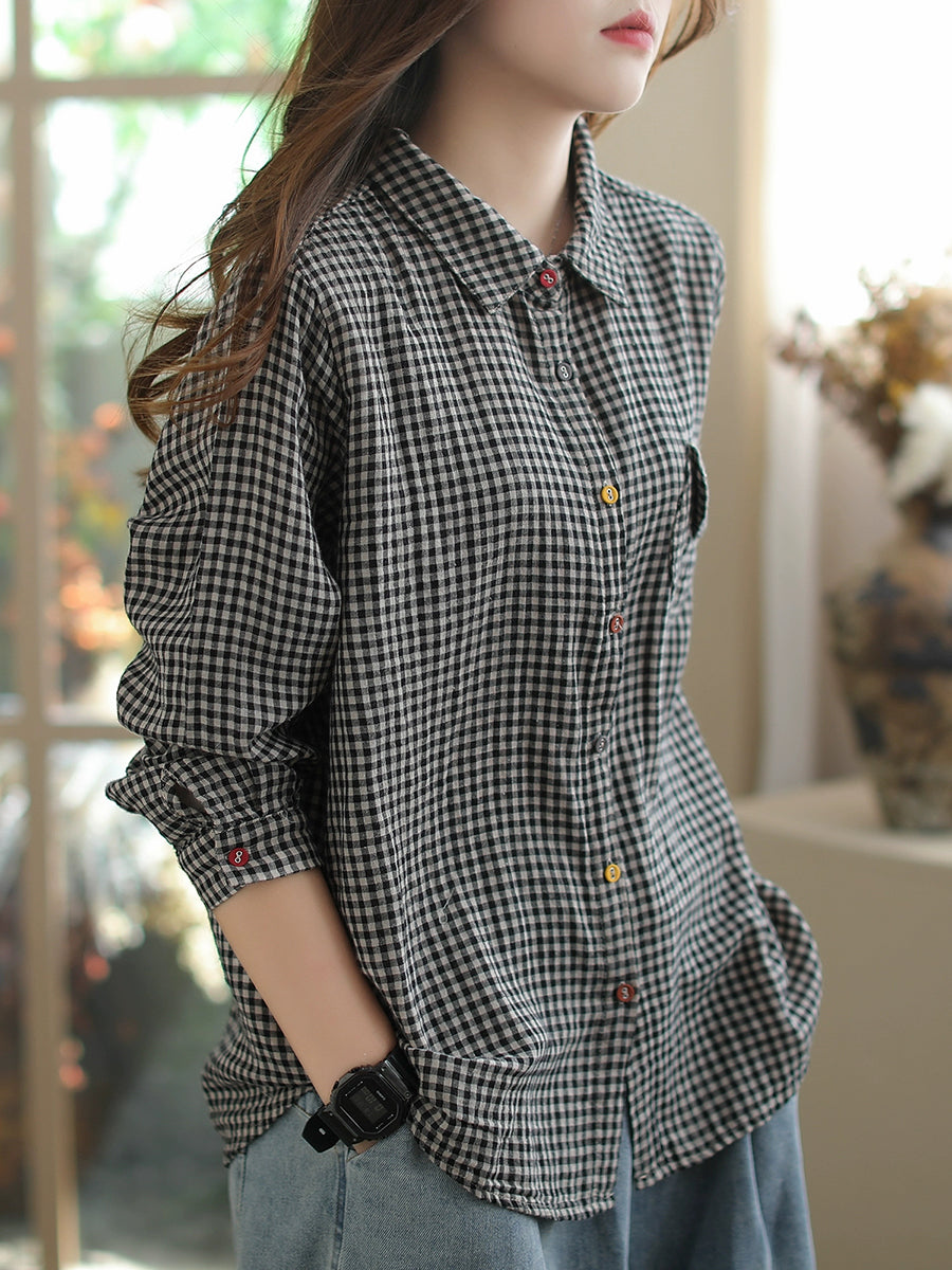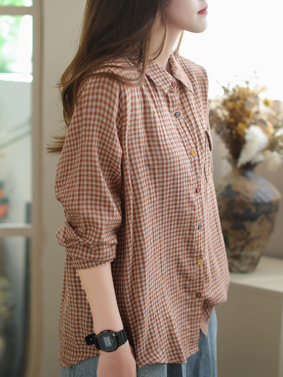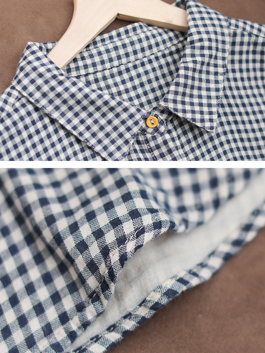 Cămașă cu guler răsturnat retro în carouri de vară pentru femei