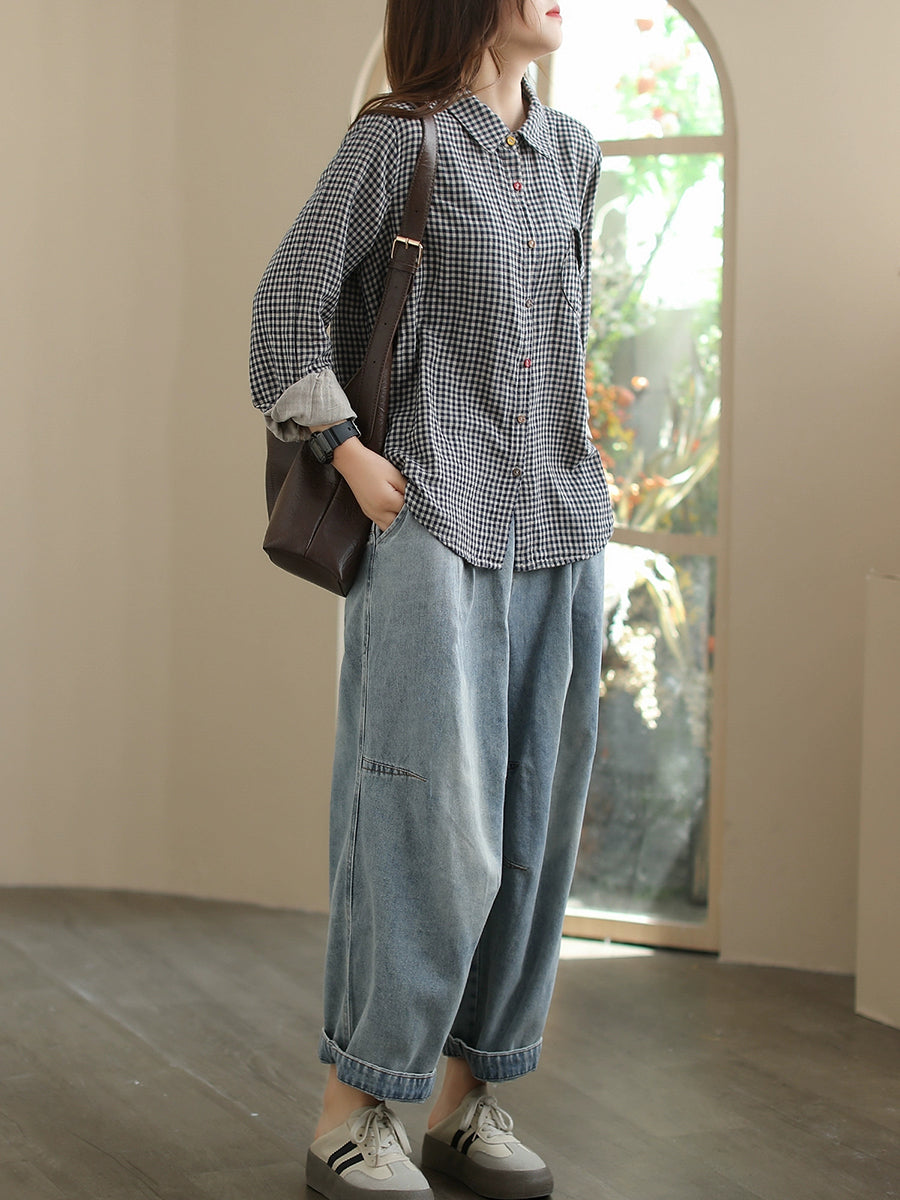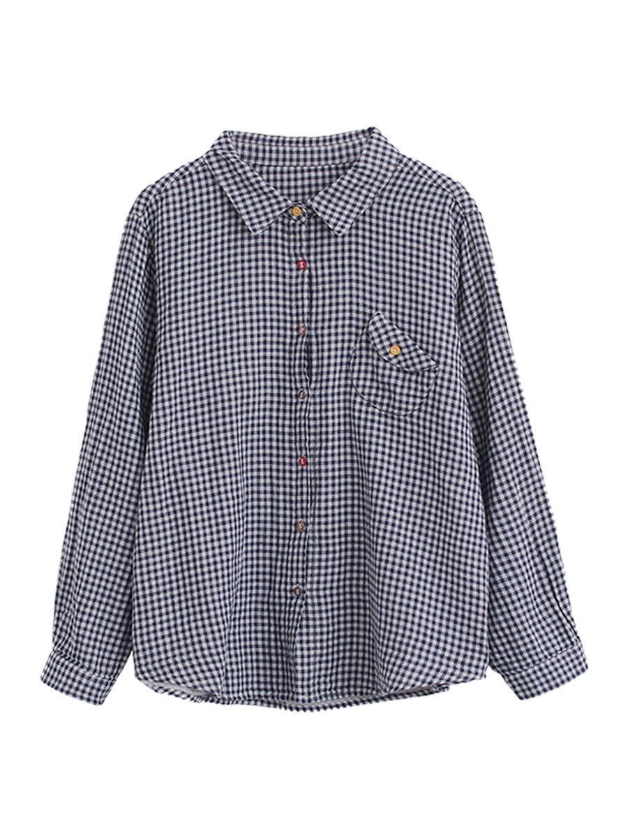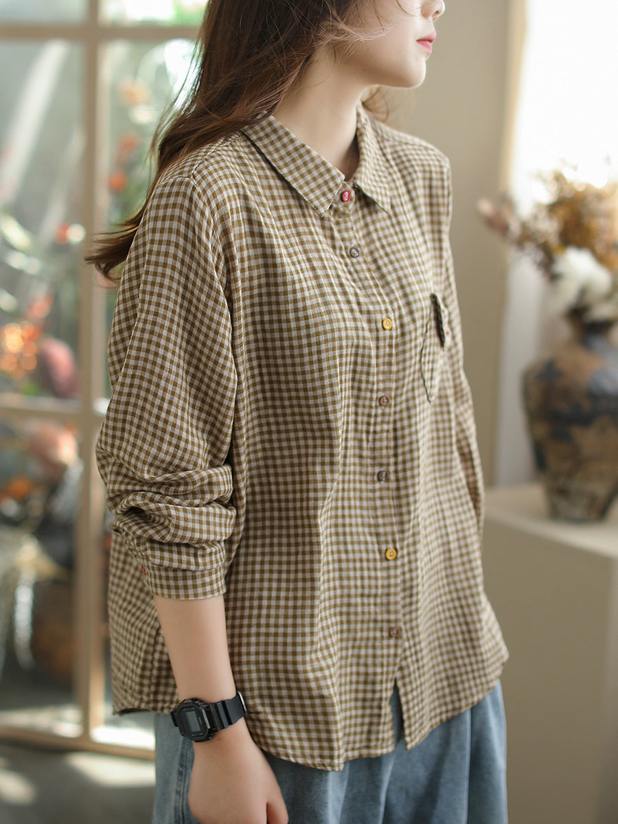 Cămașă cu guler răsturnat retro în carouri de vară pentru femei