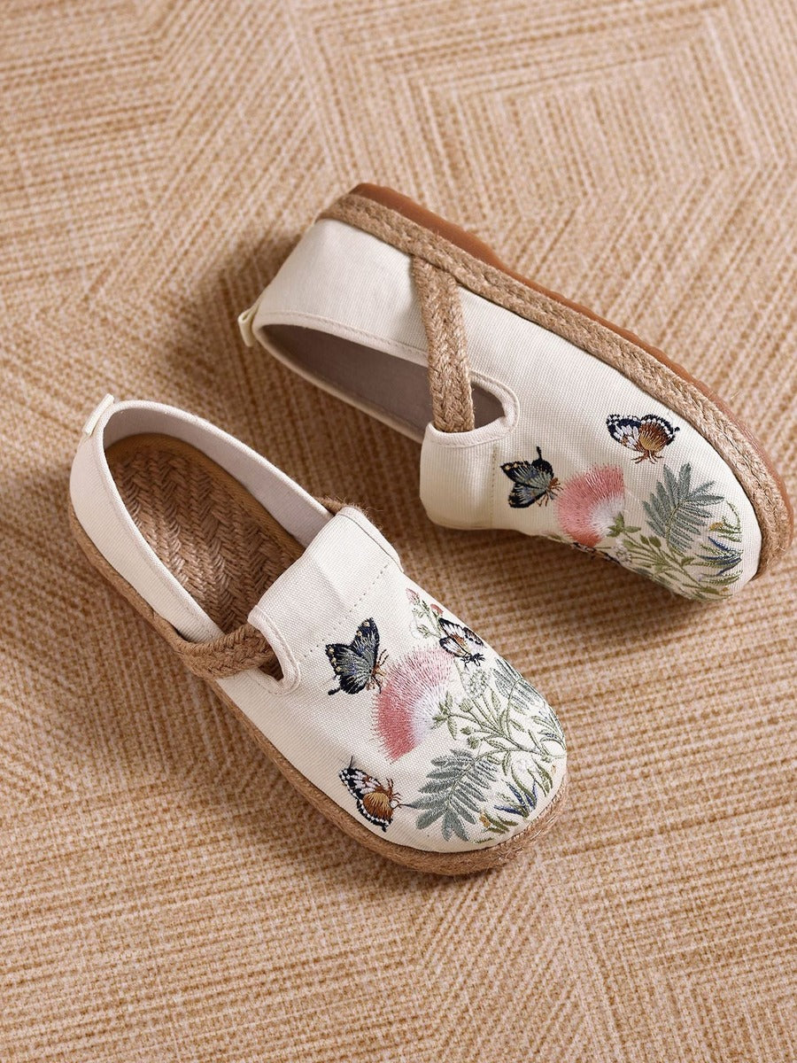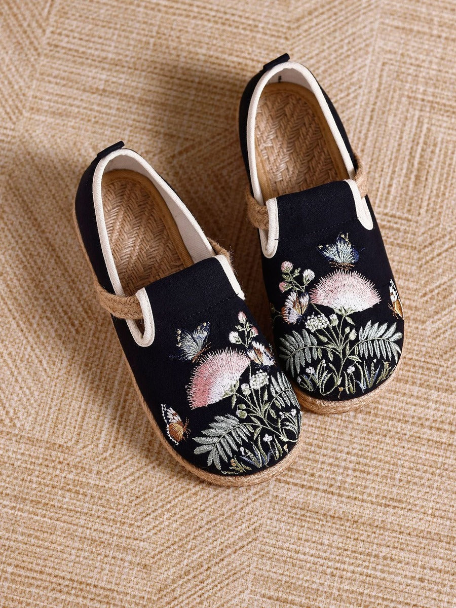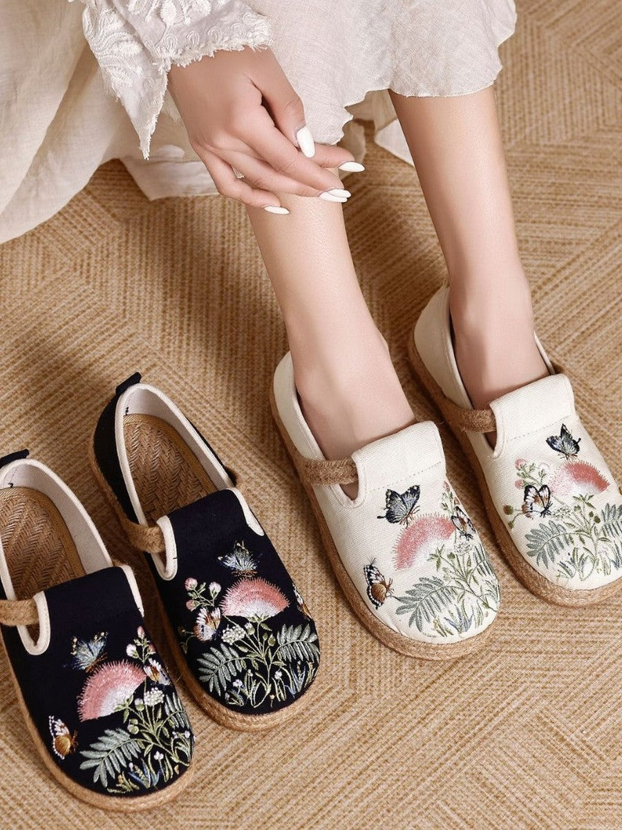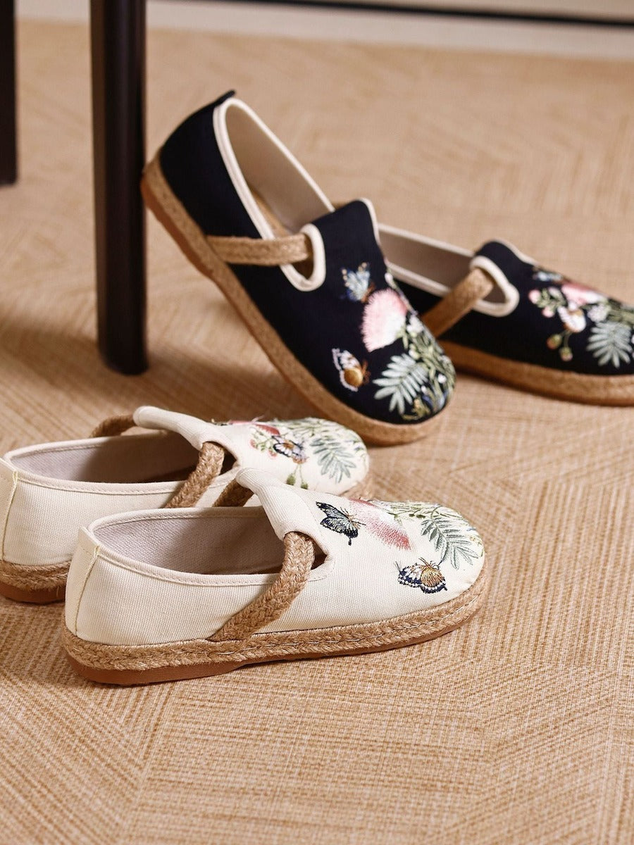 Încălțăminte vintage din bumbac și in, lucrată manual, cu detalii artizanale. Confortabilă și respirabilă, potrivită pentru purtare zilnică.