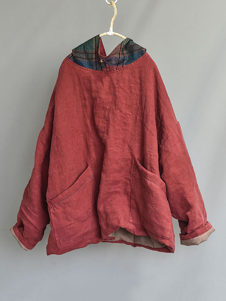 Palton căptușit din in, cu glugă, colorblock de iarnă
