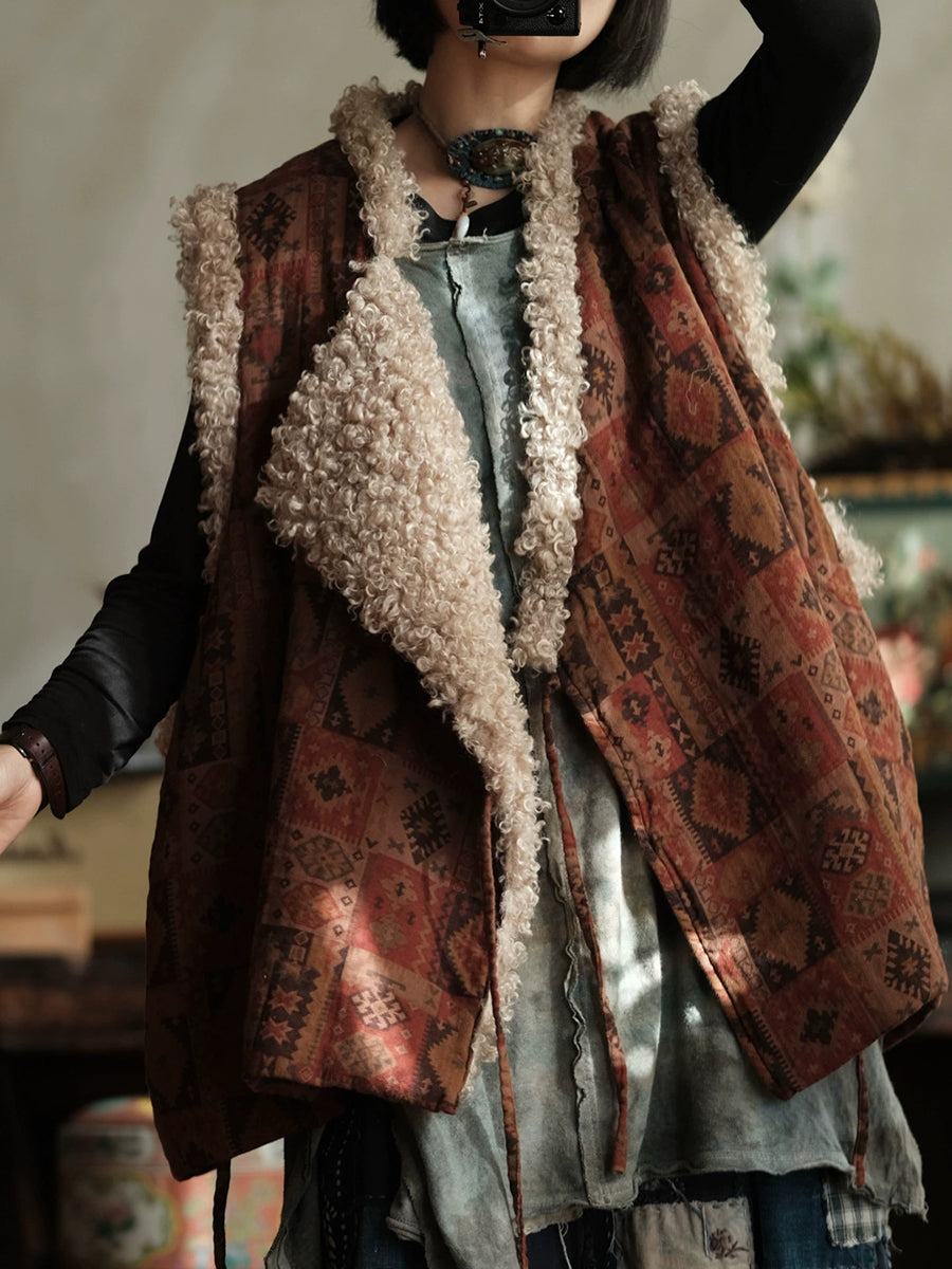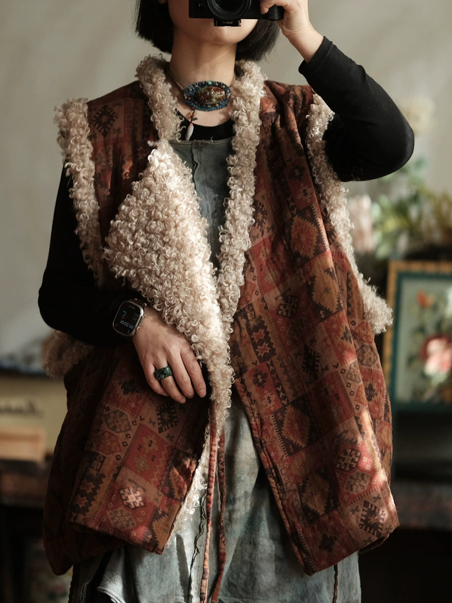 Vestă de iarnă vintage pentru femei, cu guler în V, din fleece, cu model patchwork