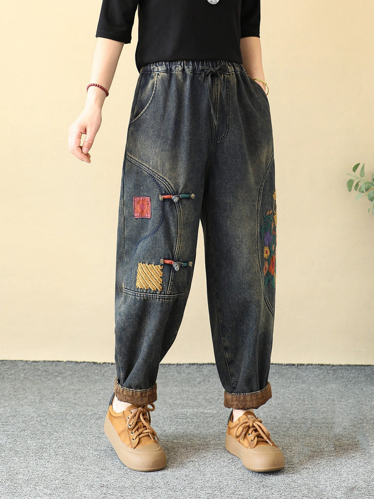 Kvinnor Sommar Blomma Broderi Denim Harem Byxor