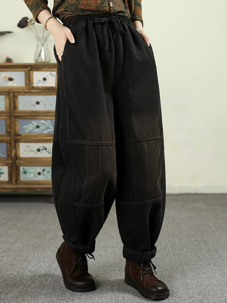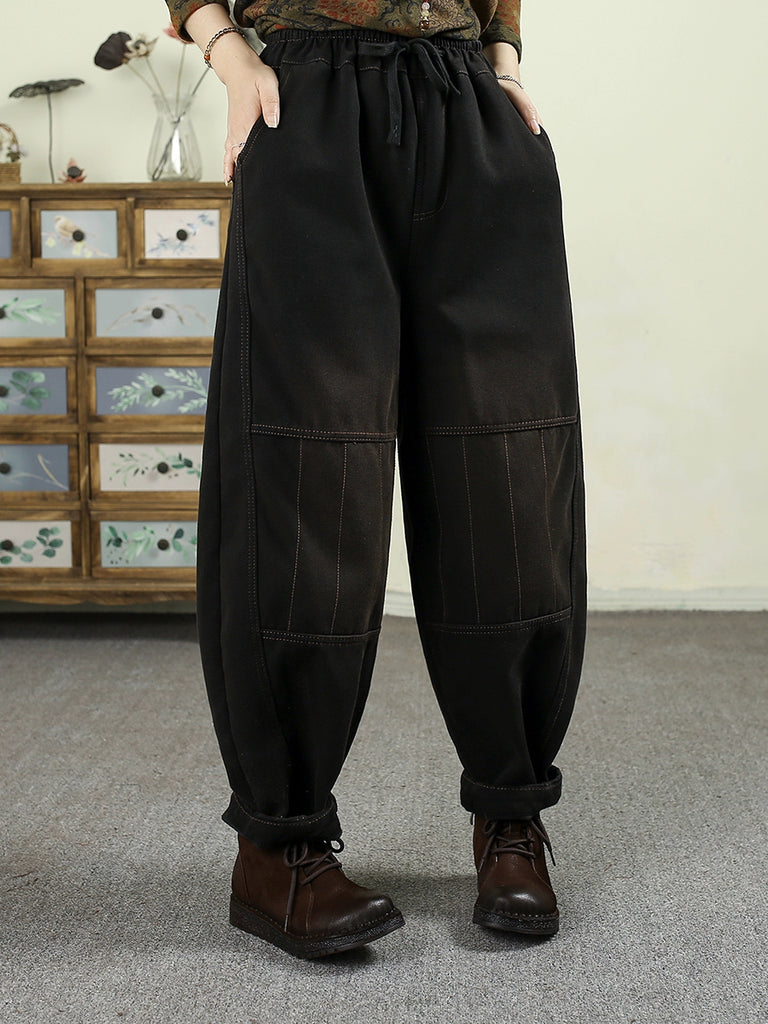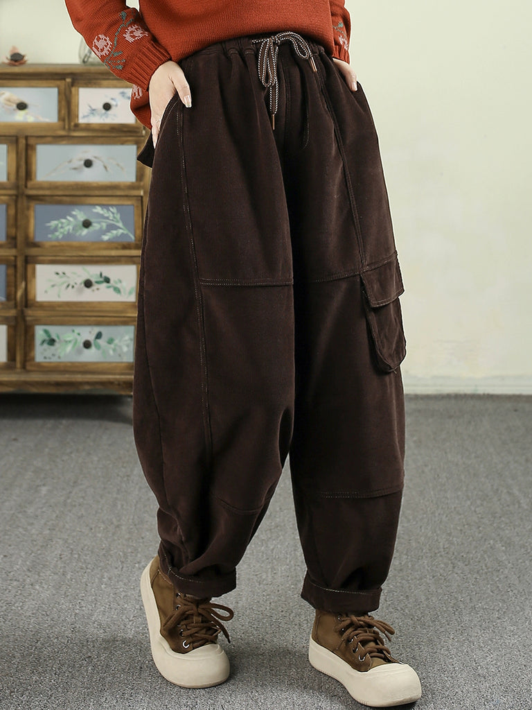 Kvinnors vinter vintage ren färg fleecefodrade harembyxor