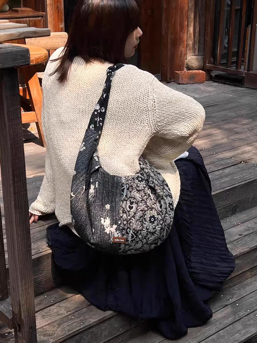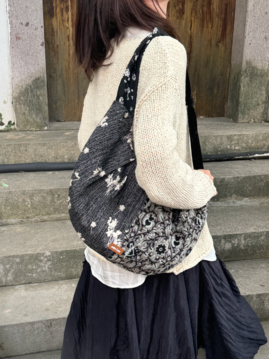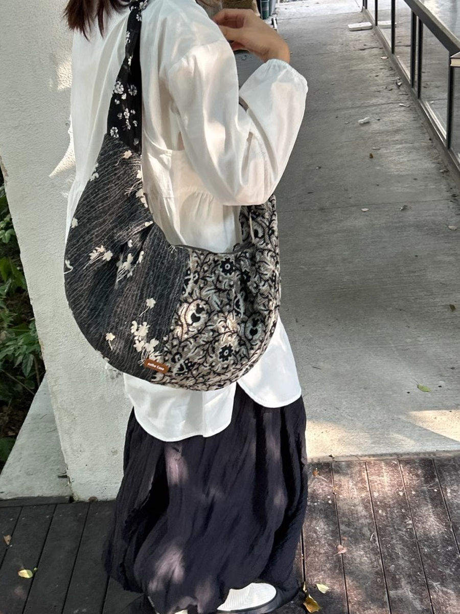 Retro tygstrukturerad blommig croissantväska med skarv