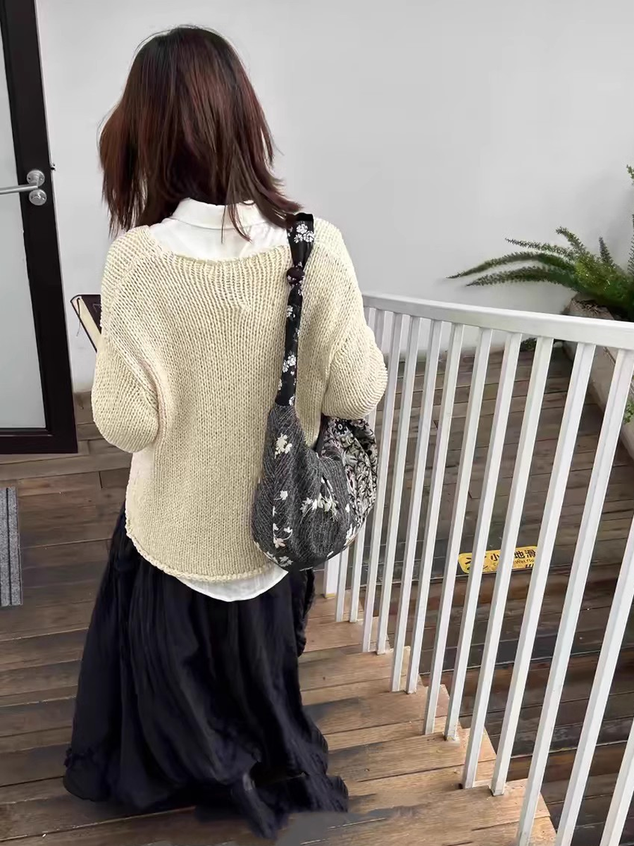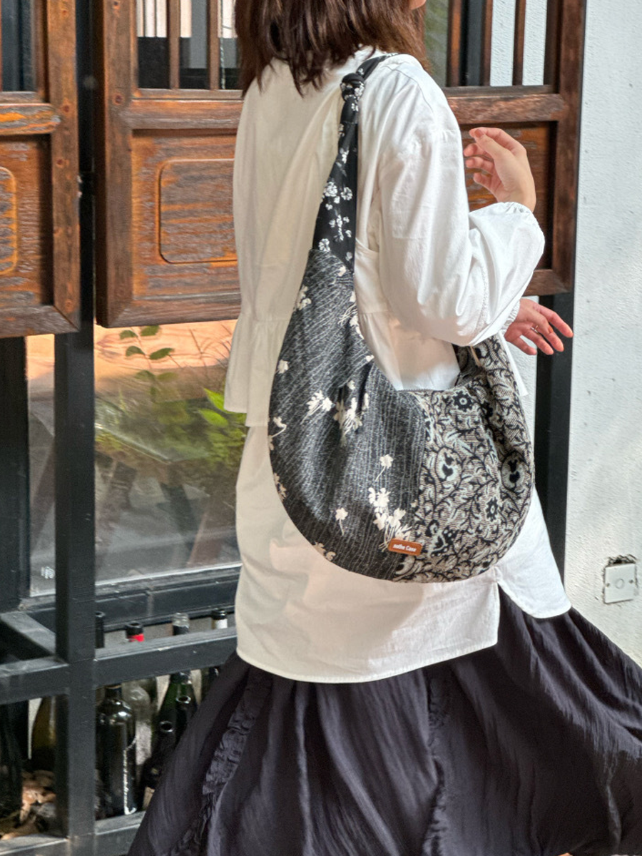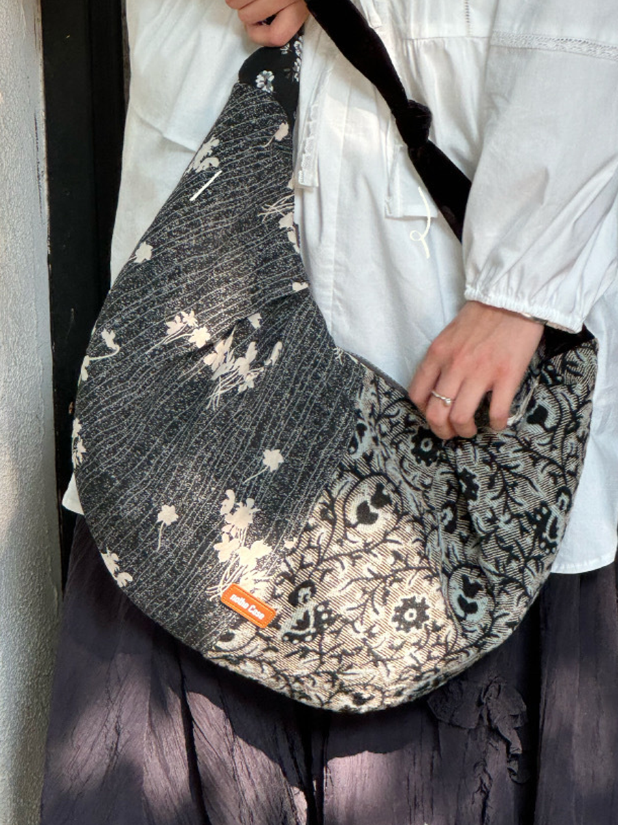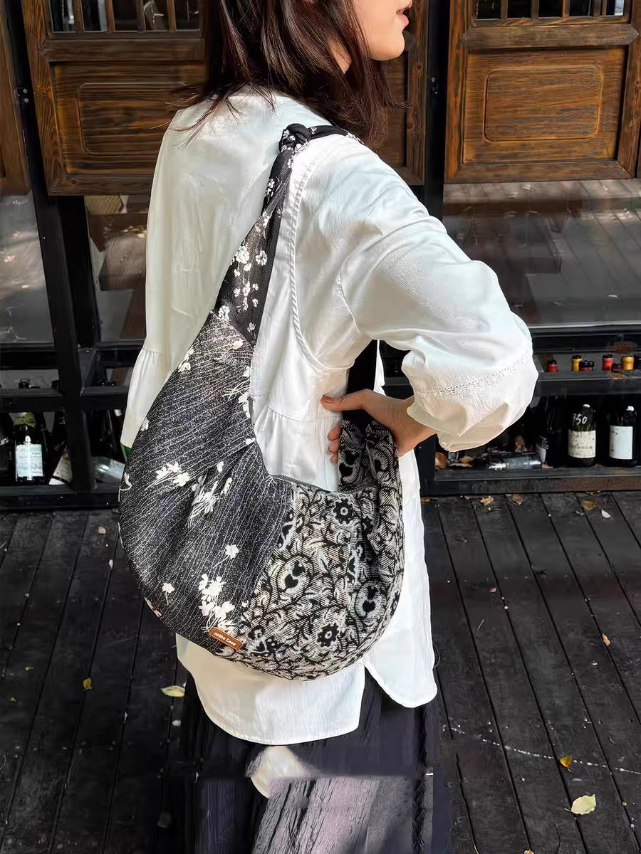 Retro tygstrukturerad blommig croissantväska med skarv