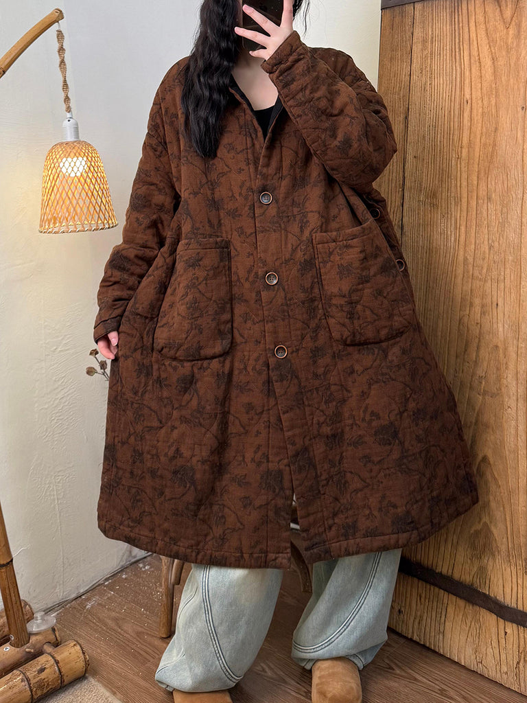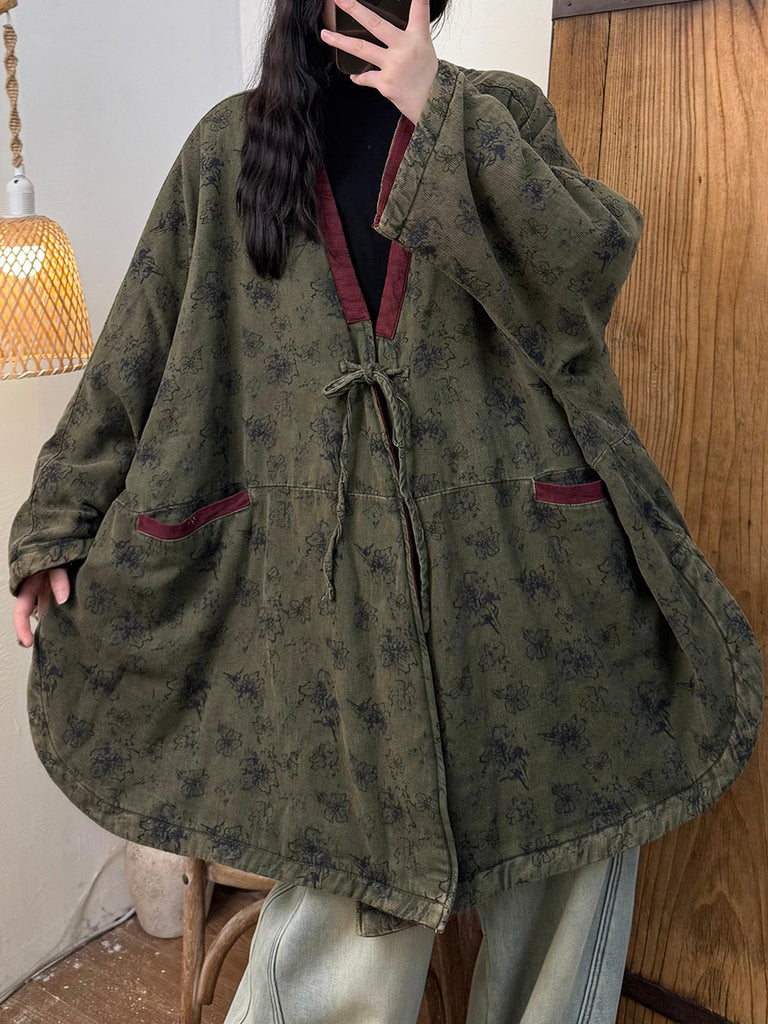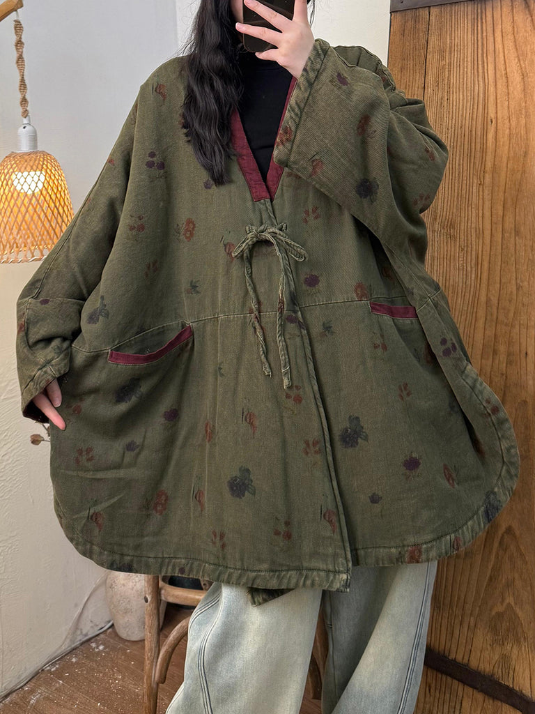 Dam Vintage Vinterblommig V-ringad Corduroy Vadderad Kappa