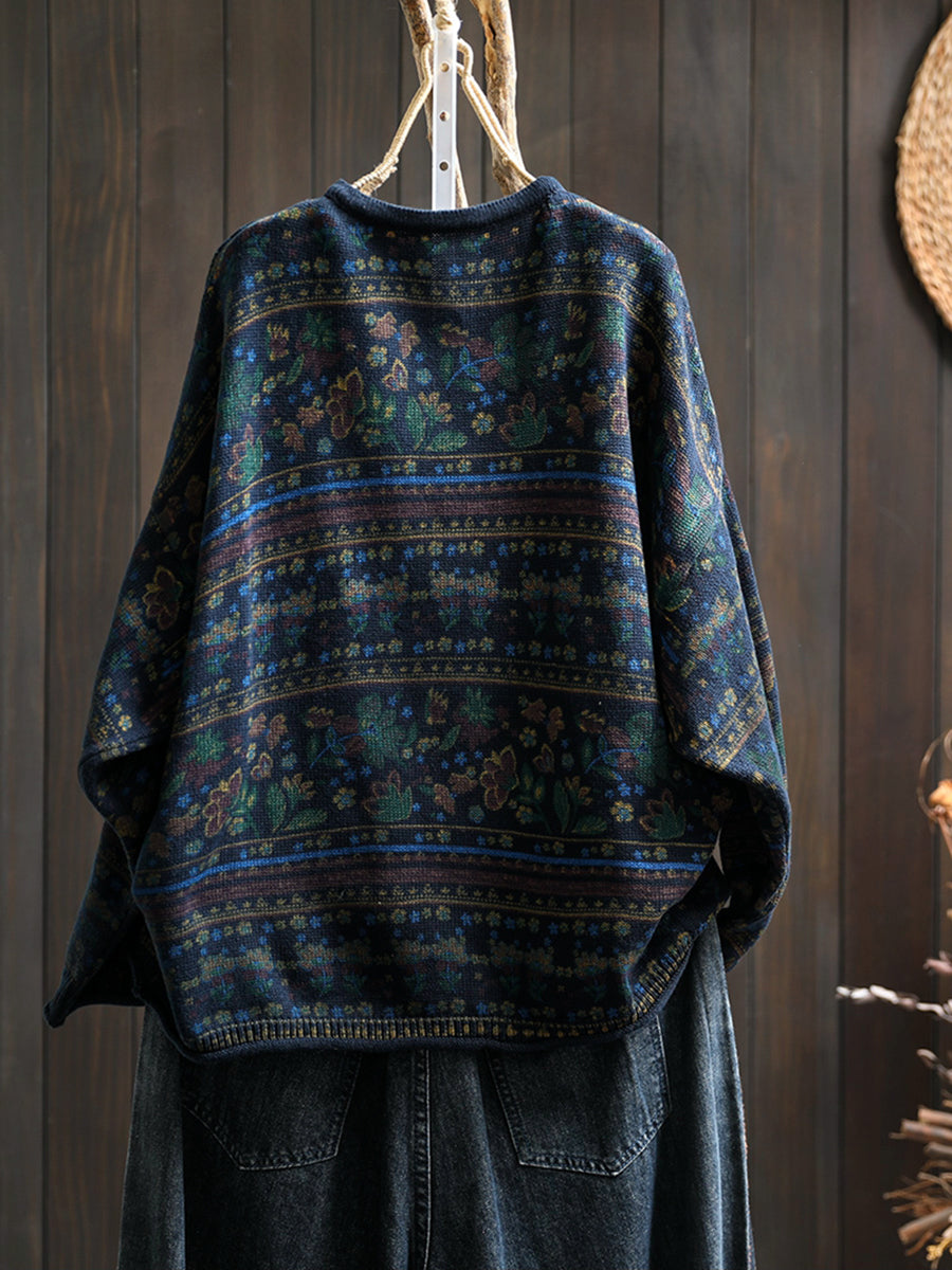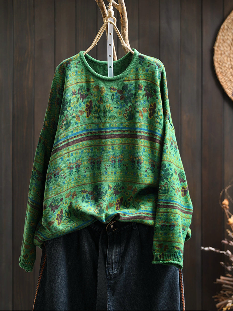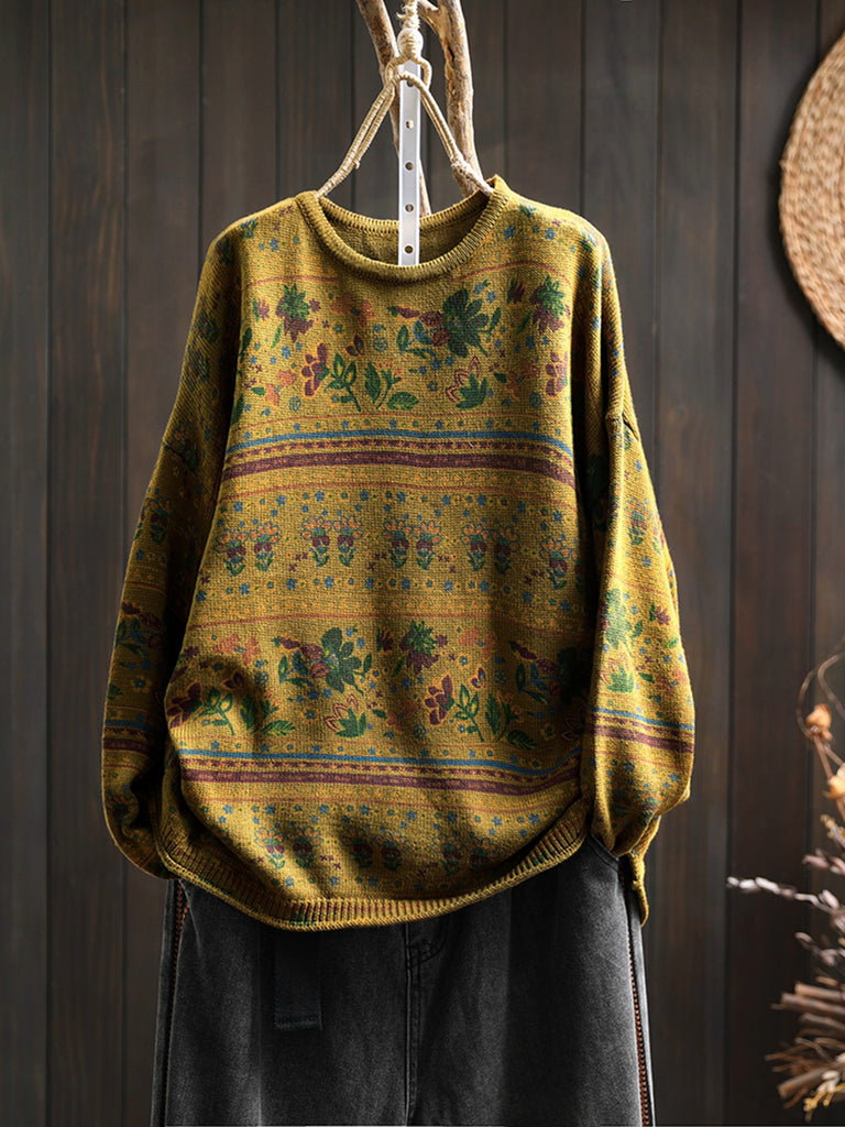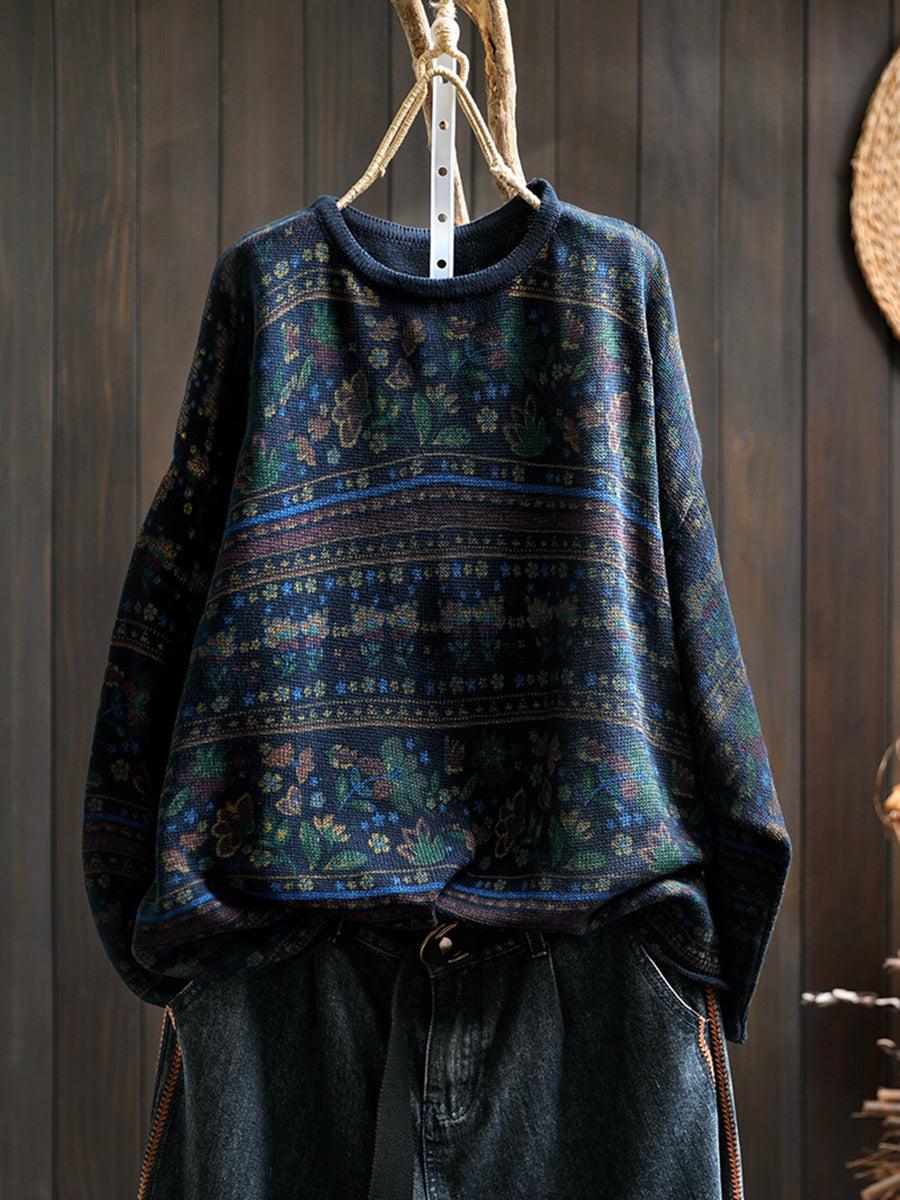 Höstkonstnärlig blommig stickad O-ringad tröja för kvinnor