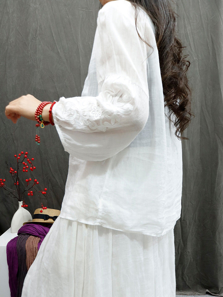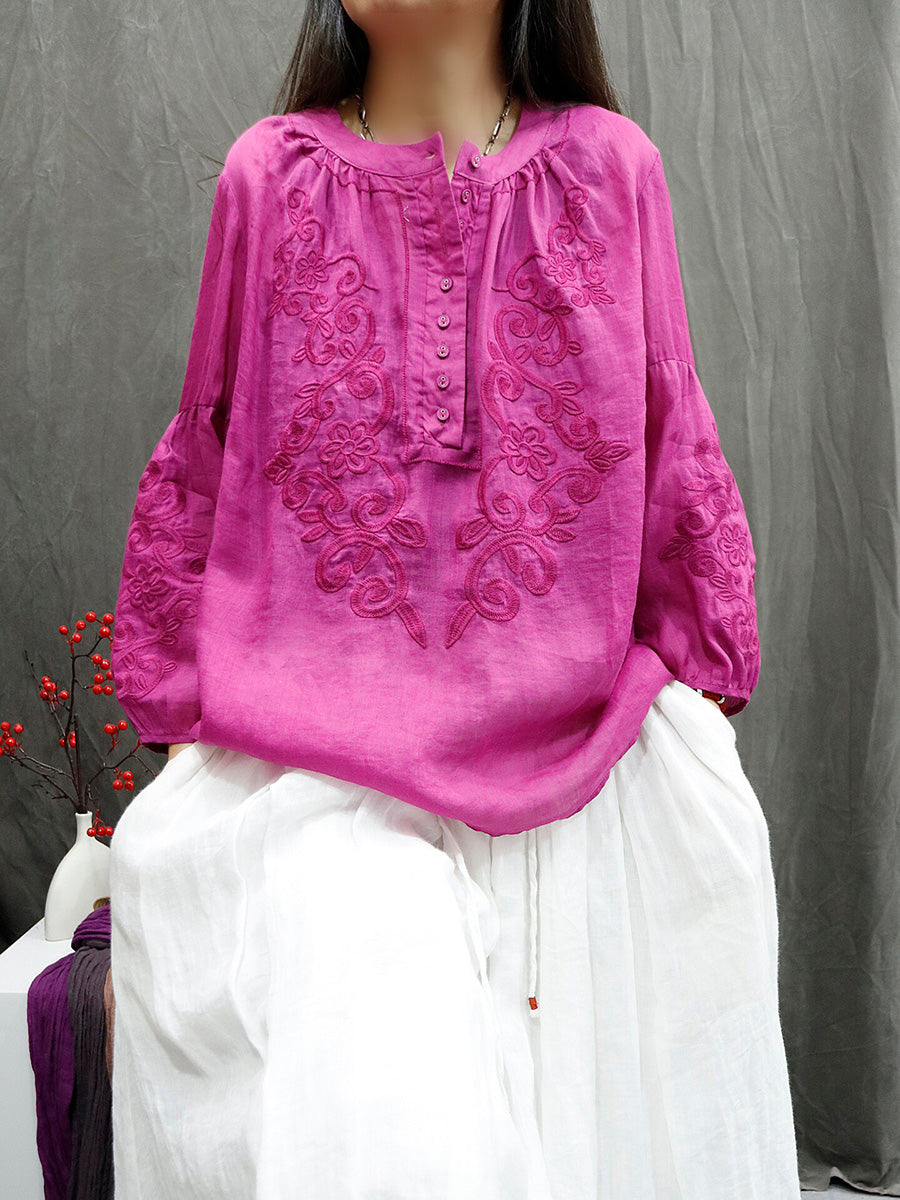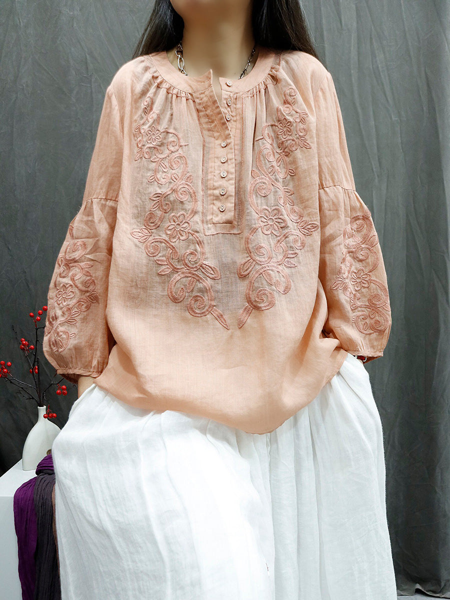 Sommarskjorta med konstnärlig broderi och O-ringning i 100 % ramie för kvinnor