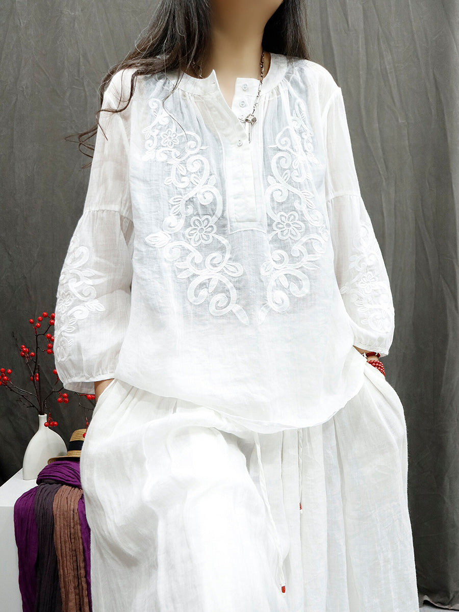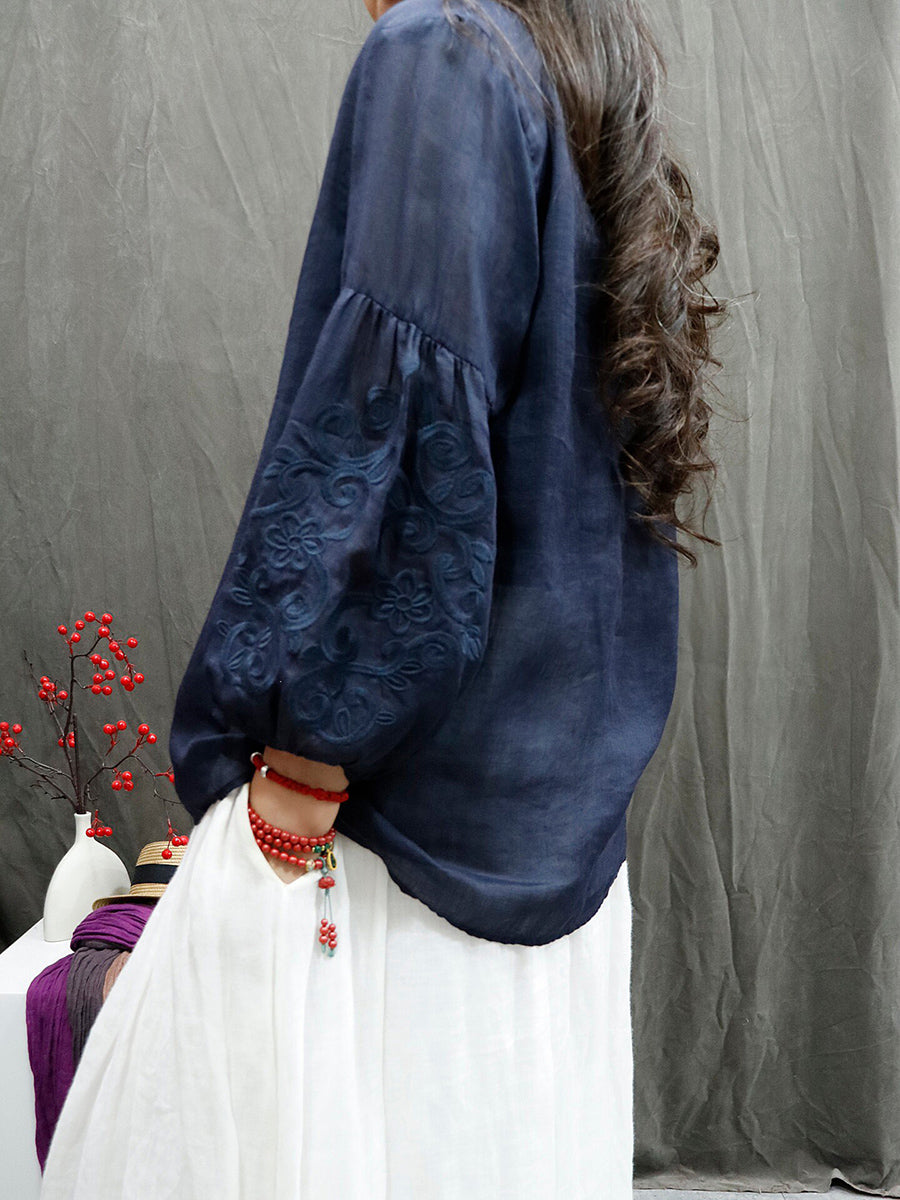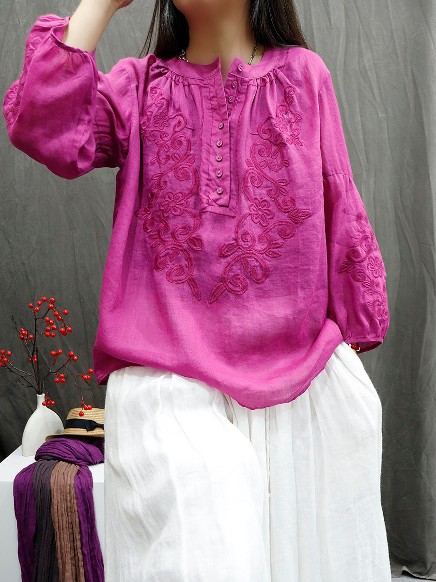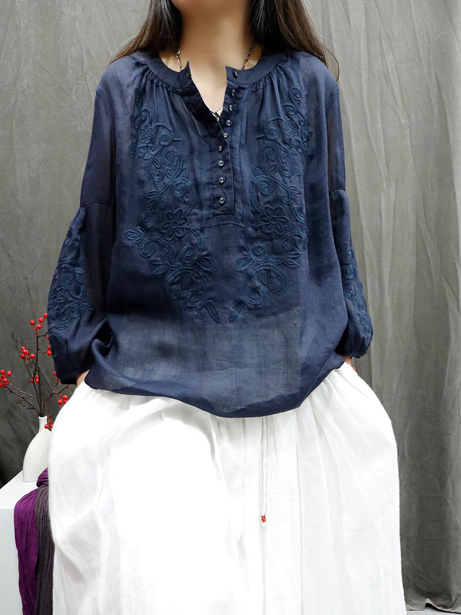 Sommarskjorta med konstnärlig broderi och O-ringning i 100 % ramie för kvinnor