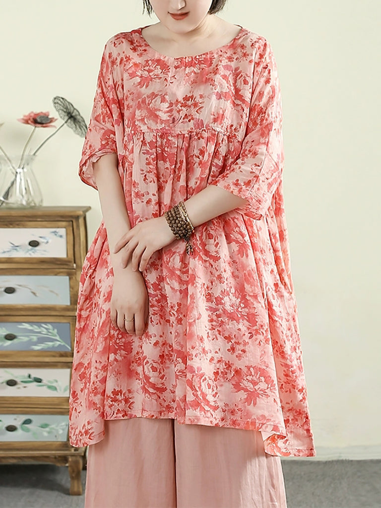 Dam sommar O-hals blomma 100% Ramie långskjorta