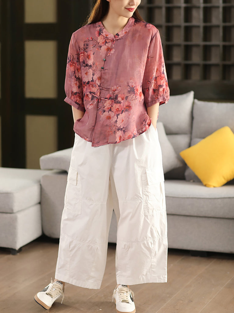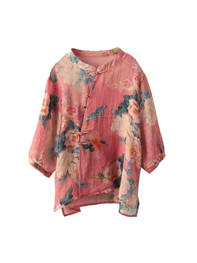 Dam Sommar Retro Flower Stand Collar 100% Ramie Shirt
