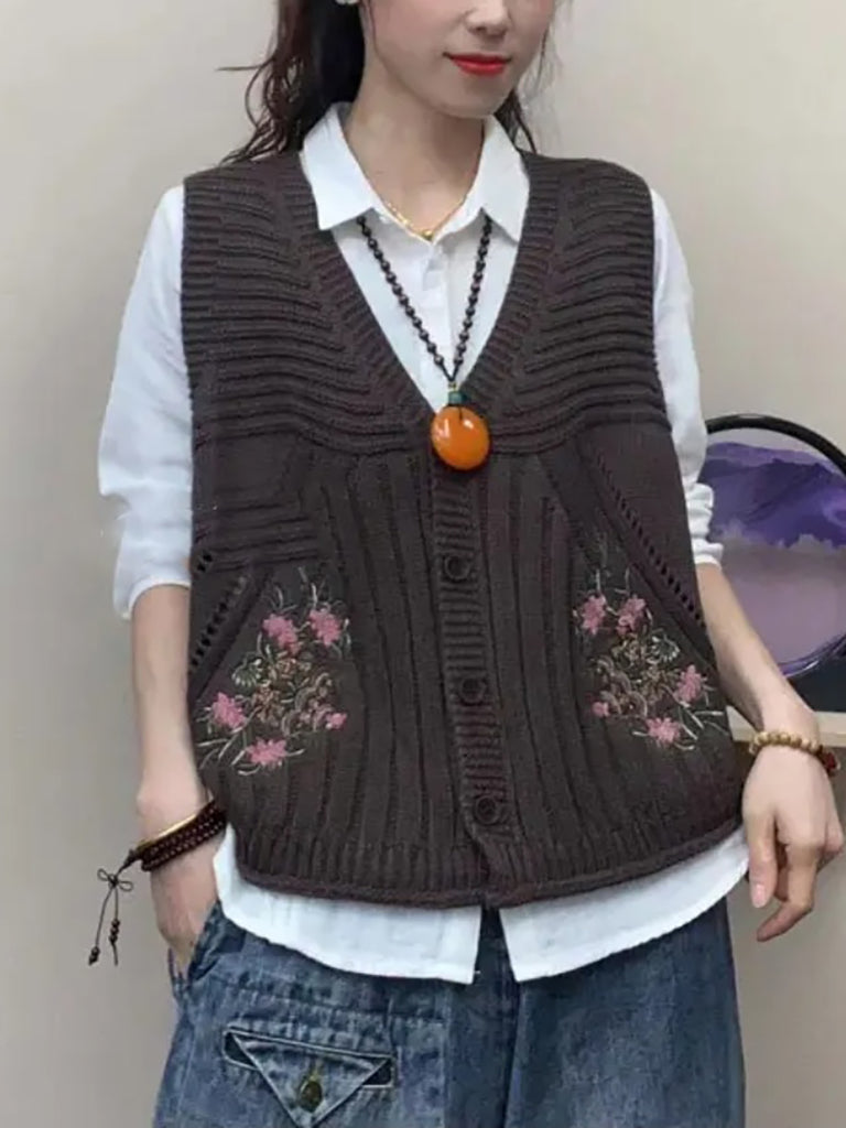 Kvinnor Vintage Blommor broderi V-ringad stickad väst