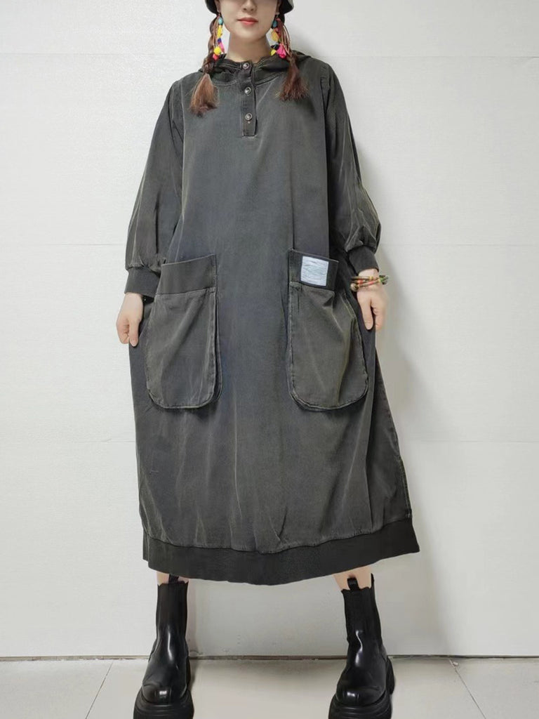 女裝秋季復古純色牛仔連帽連身裙