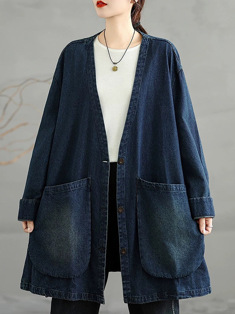 女復古秋季純色牛仔V領外套