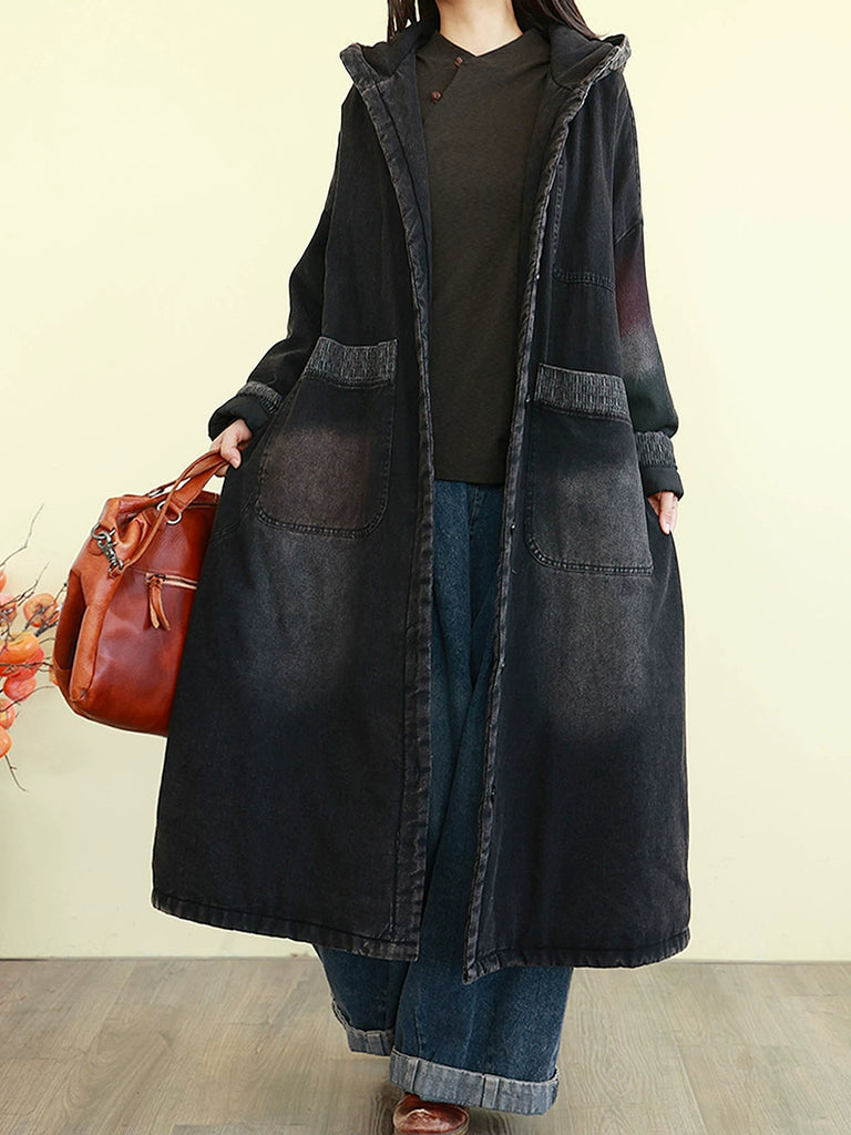 女款秋季牛仔拼色連帽長版大衣