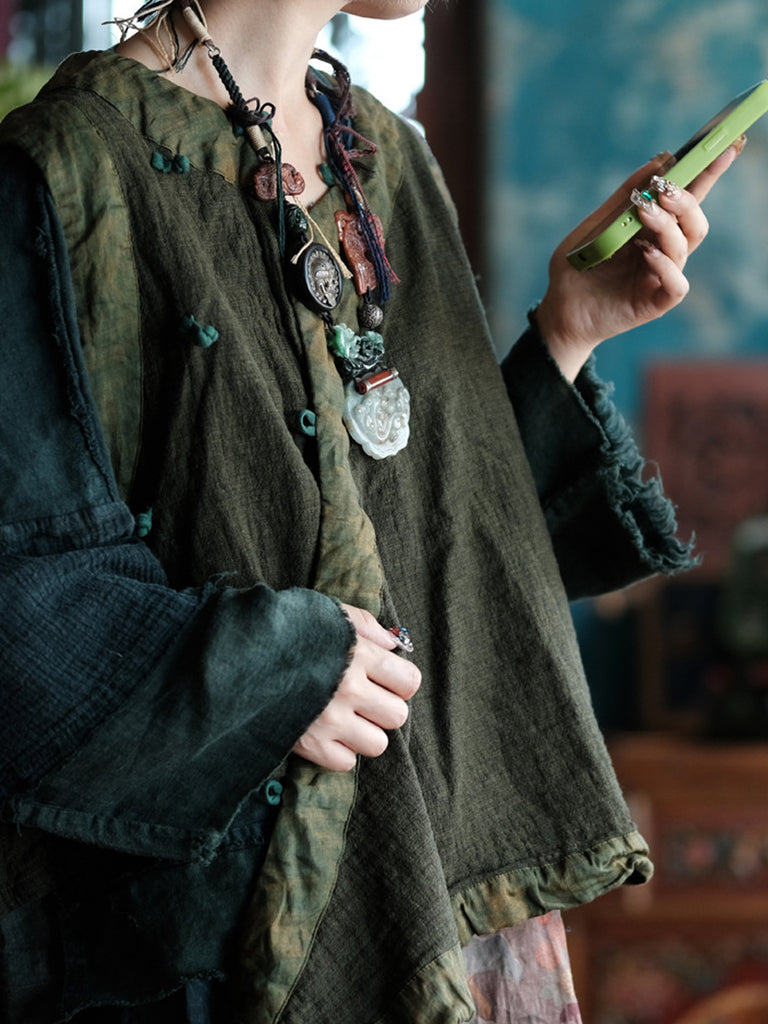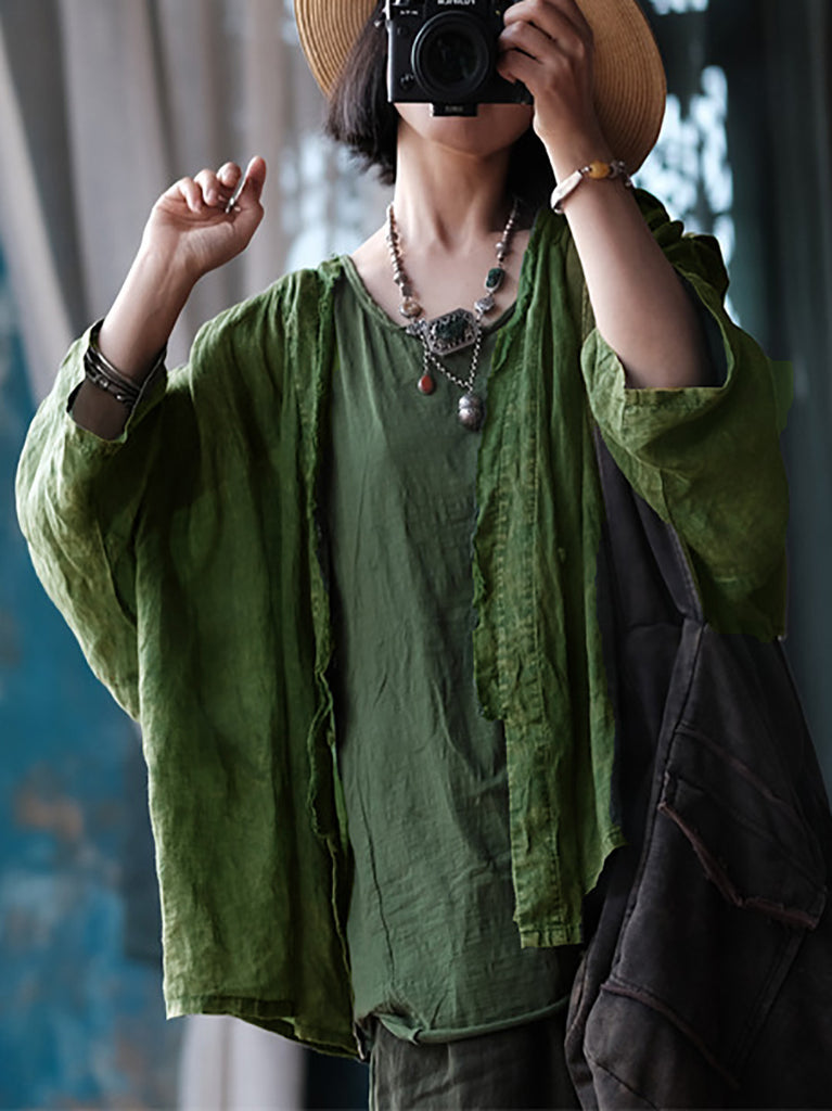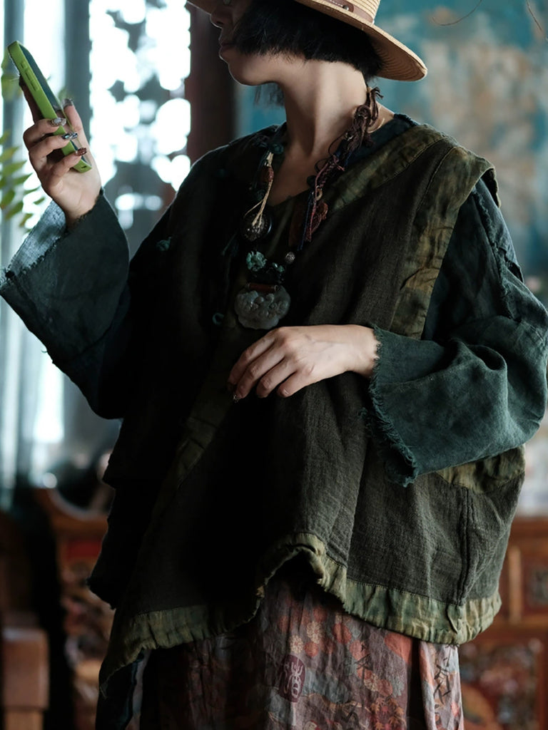 女款夏季復古花朵繫扣苧麻襯衫外套