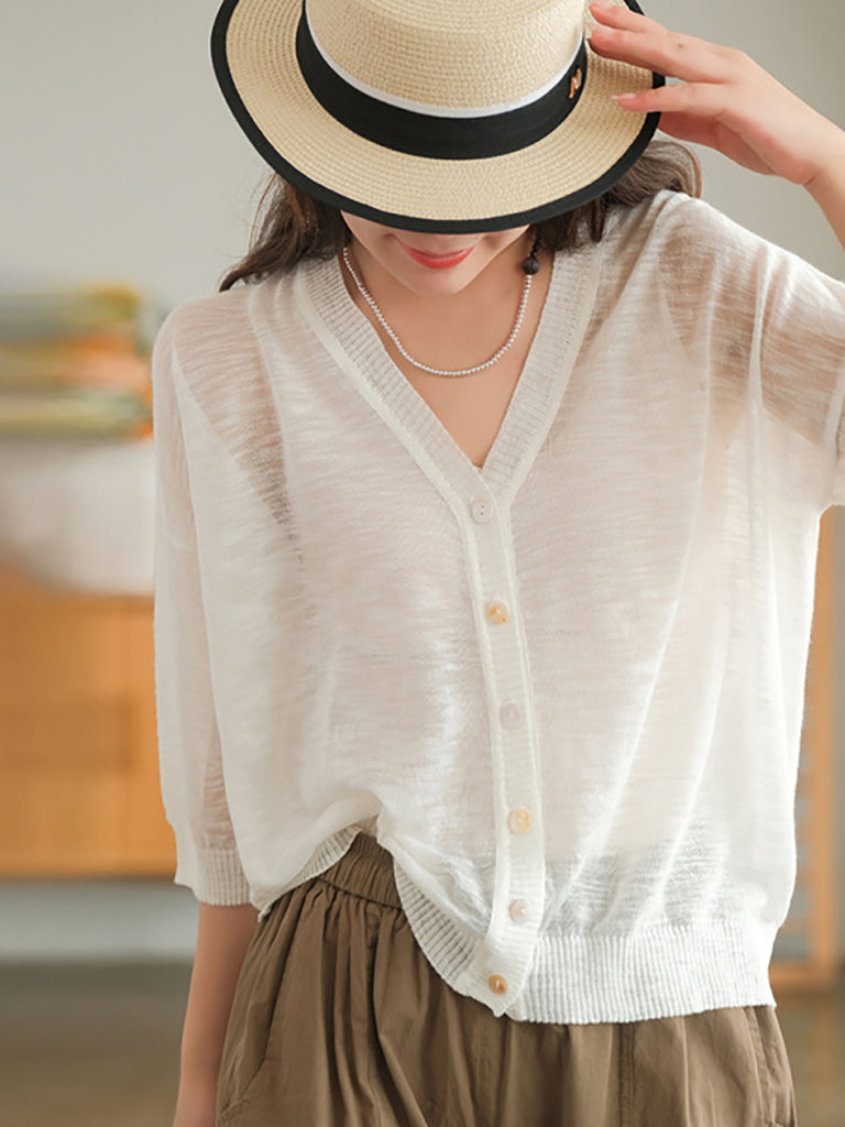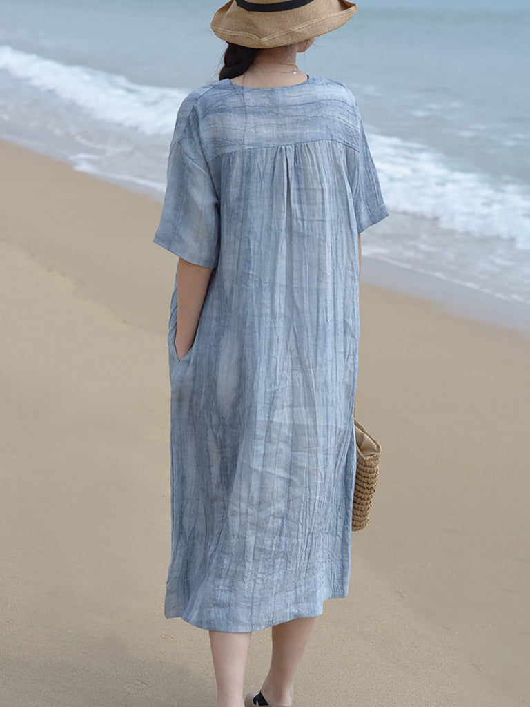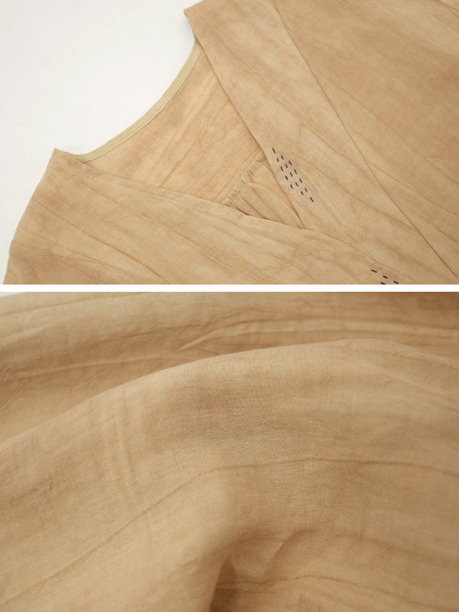 大尺寸 V 領復古亞麻女式寬鬆連身裙