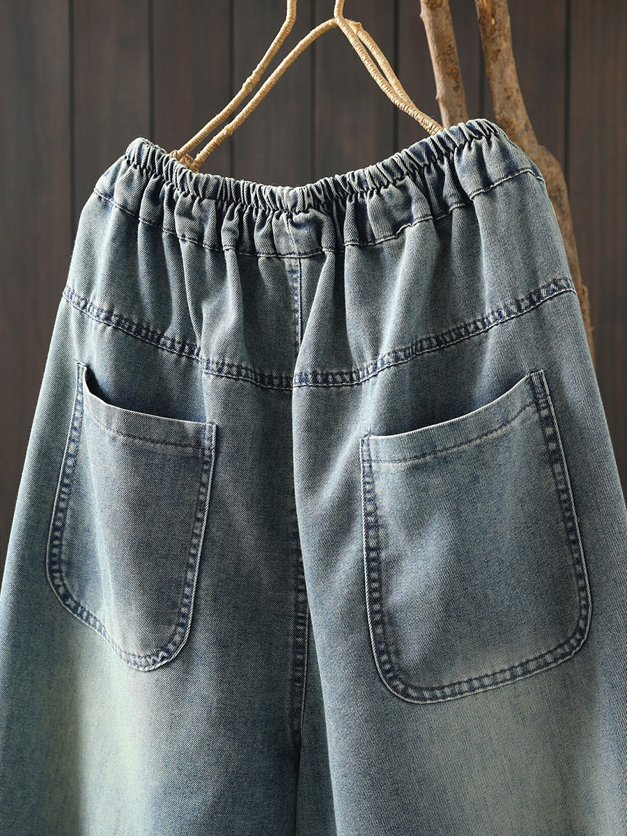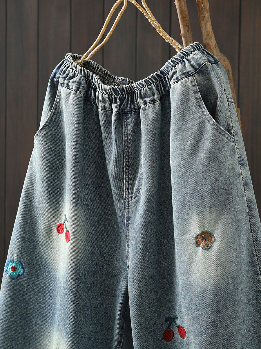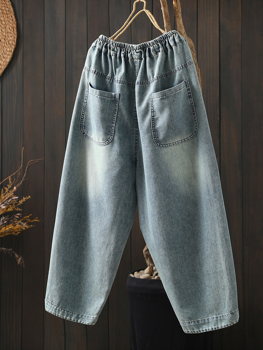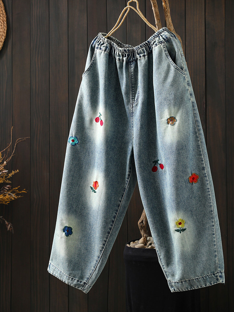 女士春季復古牛仔刺繡哈倫褲