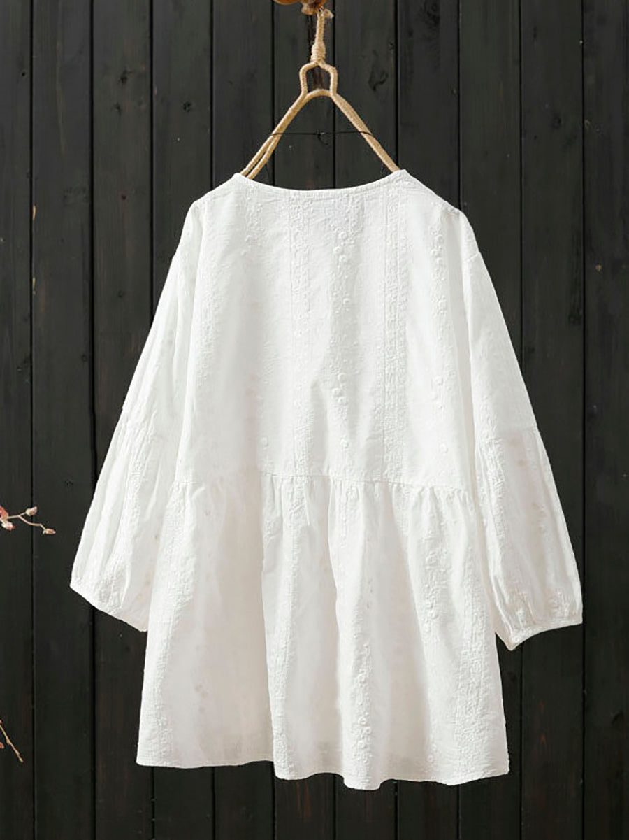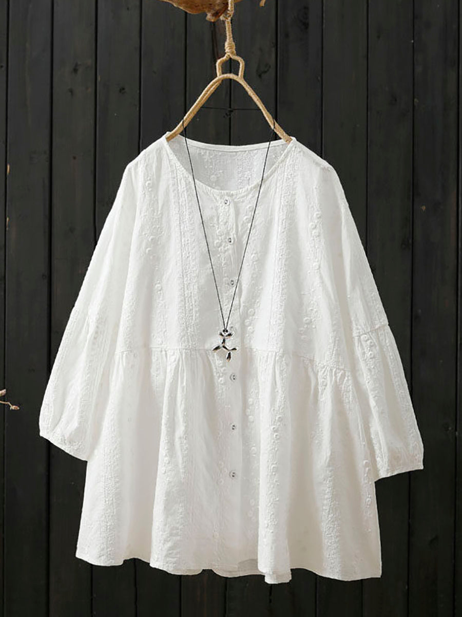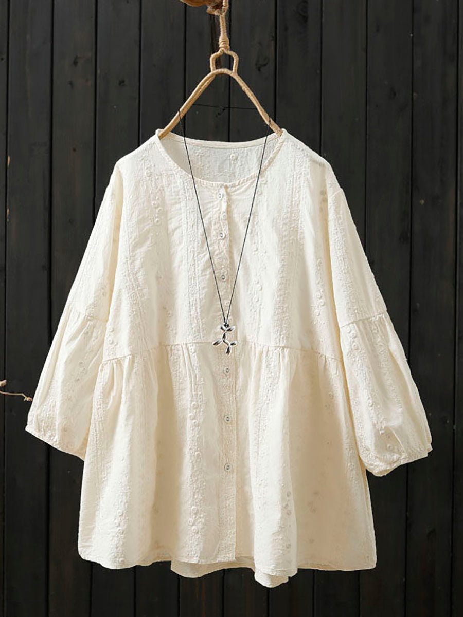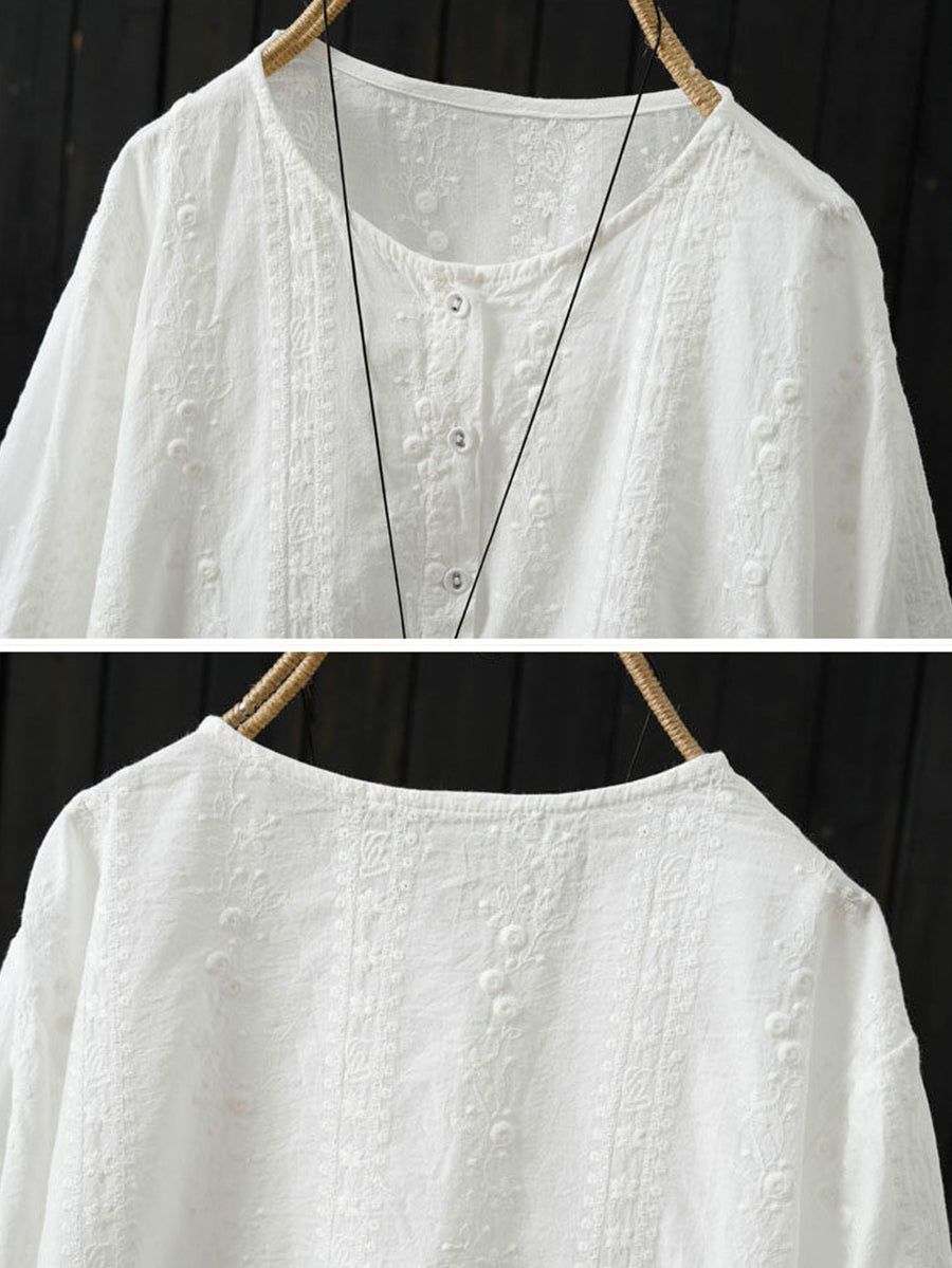 女士夏季藝術刺繡圓領100%純棉襯衫