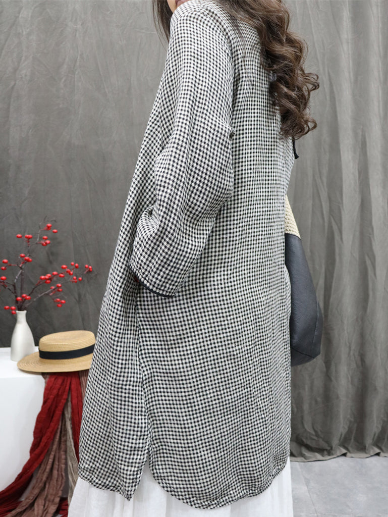 女士復古格子圓領 100% 亞麻長襯衫